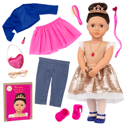 Create lovely styles with Amora, the Our Generation 18-inch doll who loves colorful fashion! She has beautiful brown eyes that open and close, and her long brunette hair is fun to brush, style, and accessorize! Unbox Amora’s outfits and start mixing and matching. Then make her shine extra bright with the sparkling heart-themed accessories - including a charm necklace, glasses, pretend nail polish, and heart-shaped purse. It zips open to carry accessories on the go! Give Amora’s hairstyles a touch of color with the pink hair extension. Or accessorize her braids, twists, updos, and ponytails with the golden tiara! Need a little inspiration? Open up the style guide and discover 3 cute styling themes featuring Casual, Party Passion, and Fun & Fancy celebrations! Outfits and jewelry pieces have easy-open closures to quickly put on and remove, so you can make Amora show her true colors on every adventure!