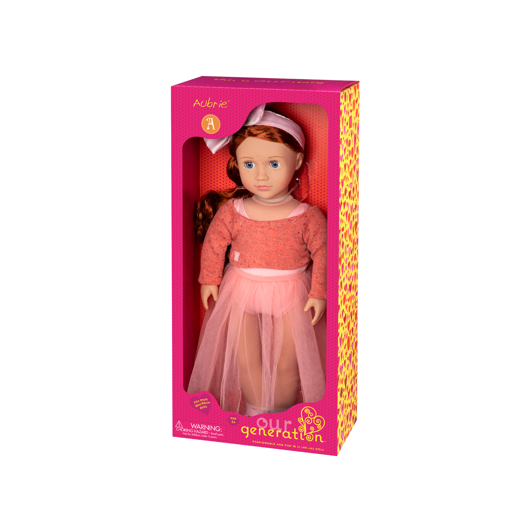 Put on a big performance with the sweet Our Generation doll Aubrie! This 18-inch ballerina has bright blue eyes that open and close, adorable freckles, and long, wavy red hair that’s lots of fun to brush and style! Aubrie is all ready for ballet. She is wearing a cozy orange sweater over her pink leotard, a long, removable tulle skirt, matching ballet shoes, and a large hair bow that highlights her playful spirit! Aubrie’s ballet outfit has easy-open closures to quickly put on and remove, so you can mix, match, and have extra fun dressing her in more fun looks after the recital! (Additional outfits sold separately)