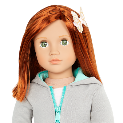 Explore bright and colorful styles with Cambi, the Our Generation 18-inch doll who loves being a fashion butterfly! She has beautiful green eyes that open and close, and her below shoulder-length red hair is fun to brush, style, and accessorize. Unbox Cambi’s outfits and start mixing and matching. Then transform her looks with the sparkling accessories – including a charm necklace, sunglasses, pretend nail polish, and golden butterfly-shaped purse. It zips open to carry items on the go! Give Cambi’s hairstyle a splash of color with the turquoise hair extension. Or accessorize her braids, twists, updos, and ponytails with the pretty butterfly hair clip! Need a little inspiration? Open up the style guide and discover 3 cute styling themes featuring Casual, Party Passion, and Fancy celebrations! Outfits and jewelry pieces have easy-open closures to quickly put on and remove, so you can make Cambi shine on every adventure!