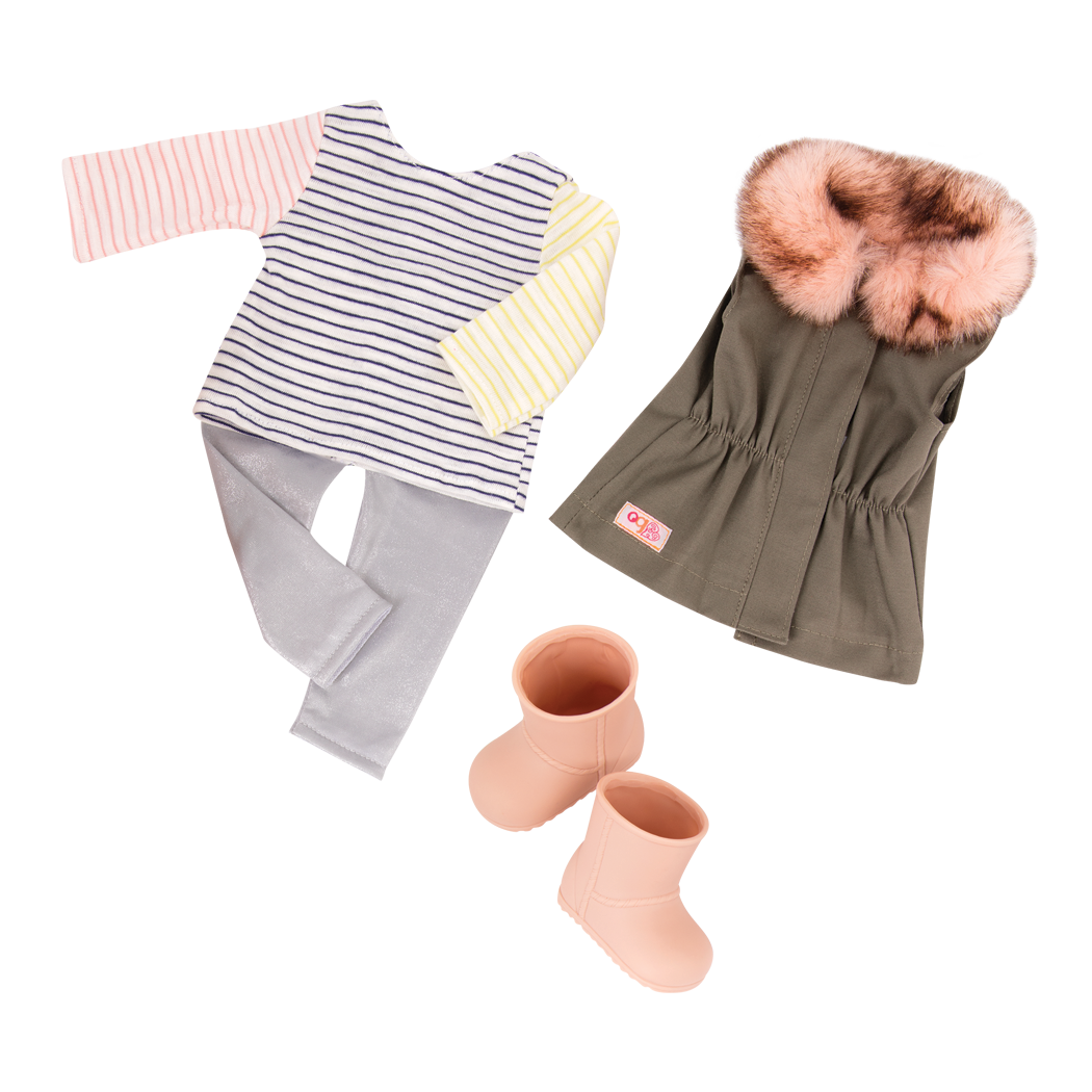 Keep your 18-inch dolls cozy and fabulous with the Our Generation Fun Fur Fall outfit! This cool-weather look is perfect for back-to-school or for any occasion. Start with the comfy and soft long-sleeved top, striped in 3 different colors. Then add the gray leggings for a cozy layer underneath, and top it all off with the super cute parka vest! The pale pink boots are the finishing touch to keep your doll's toes warm on all her great autumn walks! This outfit is compatible with most 18-inch dolls and doll clothes. Dolls sold separately.