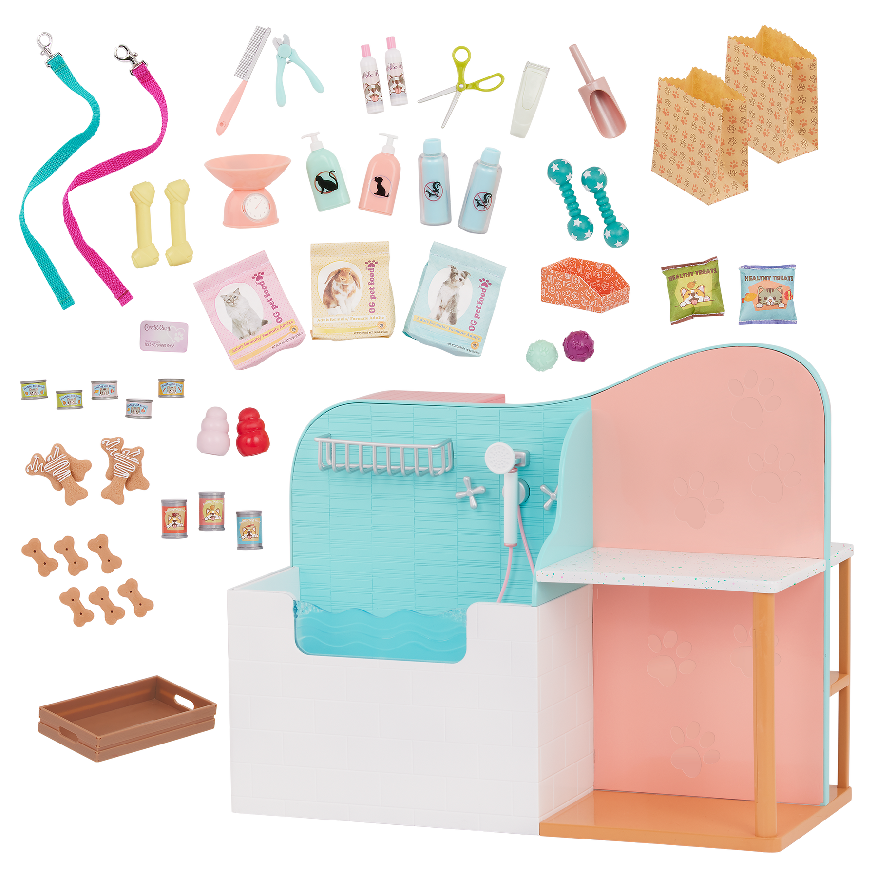Animal fans will love grooming their pet pals with the Our Generation Happy Tails Care Center for 18-inch dolls! This double-sided playset is fully equipped with accessories to keep pets healthy and clean (even if they get sprayed by a skunk!). The bathtub area comfortably fits most 6-inch plush pets. And kids can pick up the shower head to activate a fun water sound as they "wash" pups, cats, and more animal friends! Turn the playset around to reveal a pet shop and discover even more role-play fun. Scoop yummy treats into the food scale and fill up the 2 shopping bags for customers to carry home. Then, use the credit card at the pretend touch-screen cash register! Shelves, counters, a portable tray, and a display hook give kids lots of storage space to neatly organize accessories. The Our Generation Happy Tails Care Center is a great gift for kids who love exploring the world of pet care. Compatible with most 18-inch dolls, stuffed animal toys, and accessories. Dolls and pets sold separately.