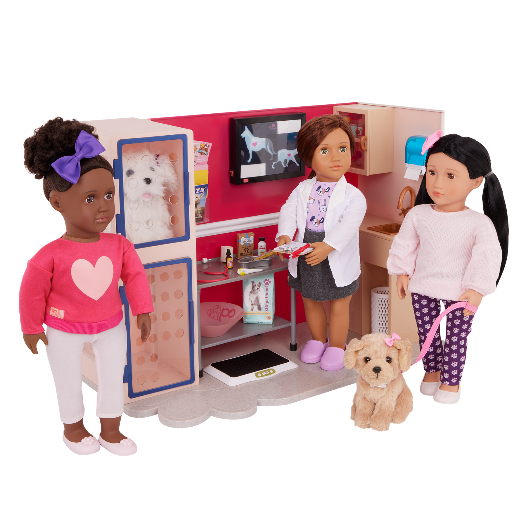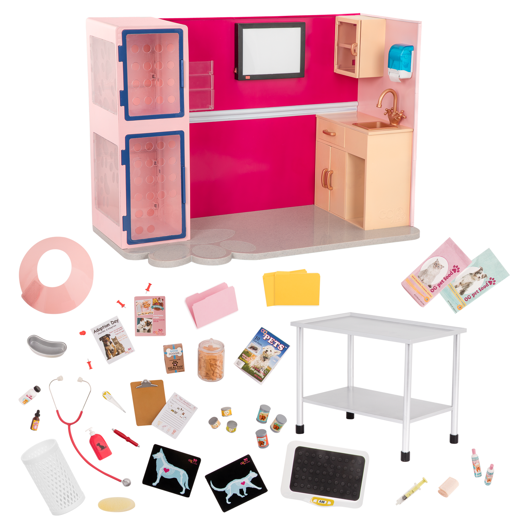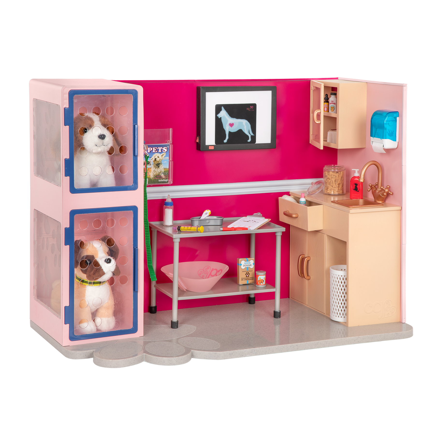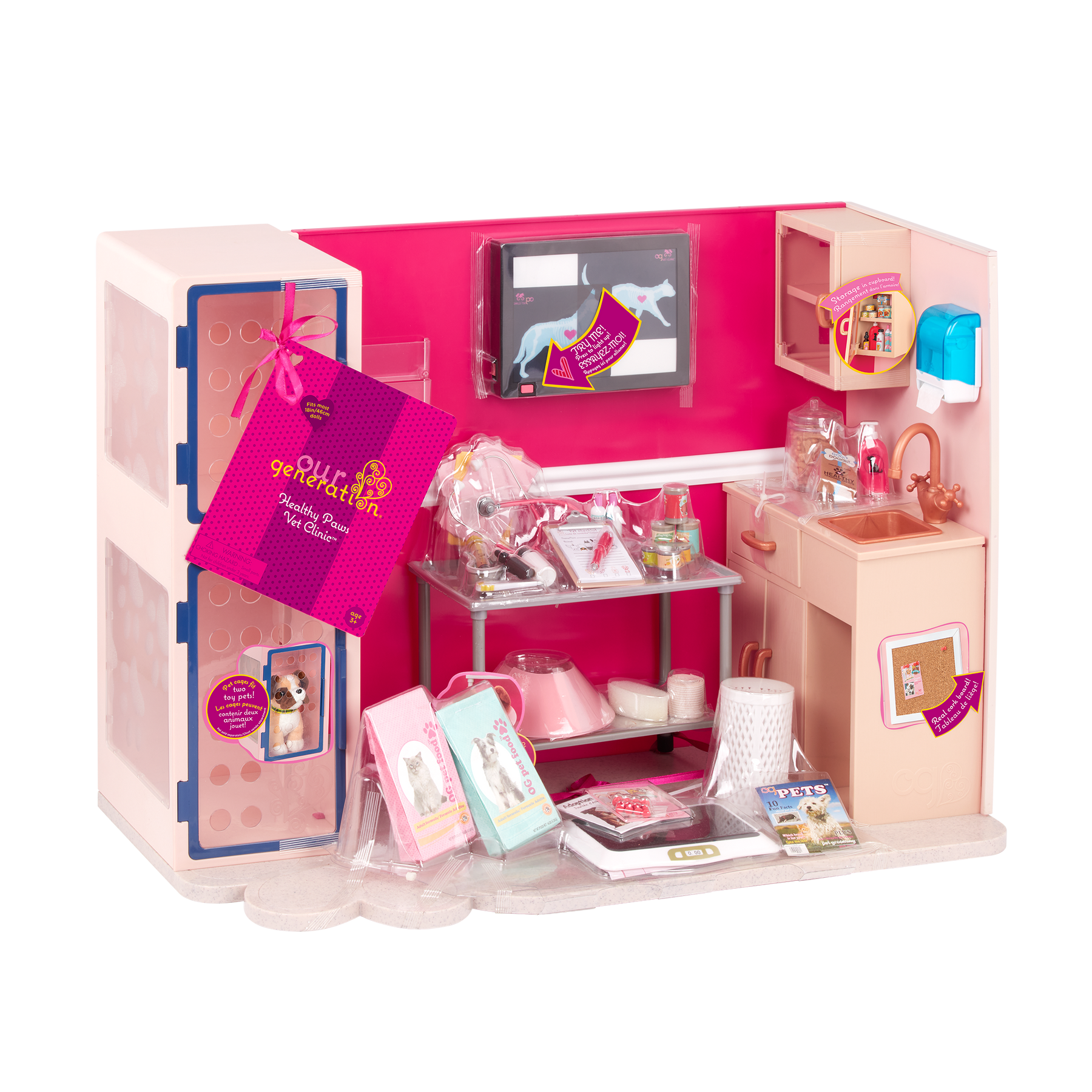 Keep your loyal pals happy and healthy from nose to tail with the Our Generation Healthy Paws Vet Clinic! This fully stocked, open-style playset is filled with realistic doctor accessories to help all your animal pals - from feathers to fins to fur! Browse the delicious treats or magazines on display until it's time for your pet's checkup. Then collect all the folders from the real cork board as you lead your pets into the exam room to play doctor with your favorite 18-inch dolls! Take x-rays with the light-up light box to scan your puppy pals for any injuries. And give your pups a quick recovery by having them stay overnight. They comfortably fit inside the 2 cozy kennels, and it will keep them safe and sound until your dolls can take them home the next day. The Healthy Paws Vet Clinic is sure to make tails wag with joy! (Dolls and pets sold separately)