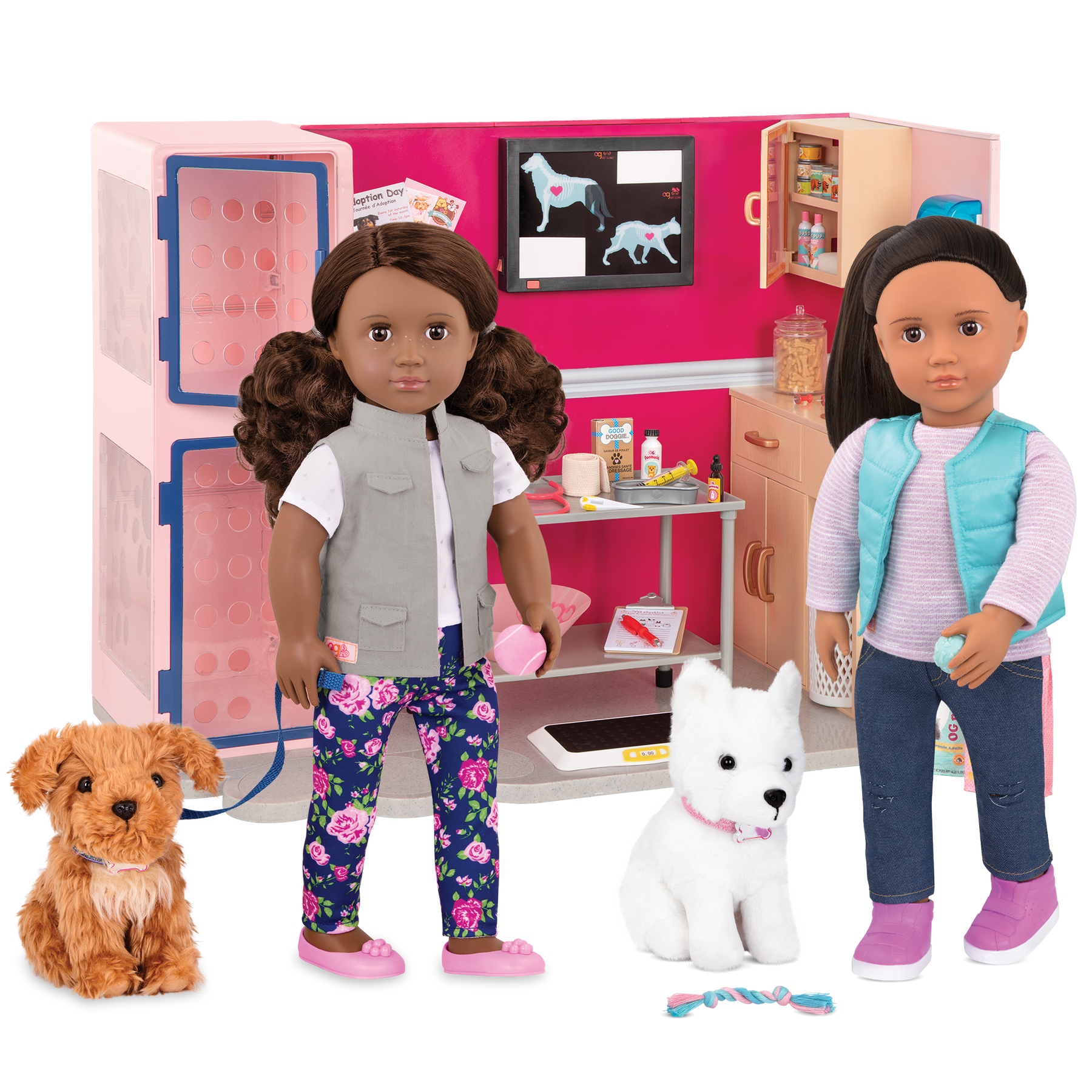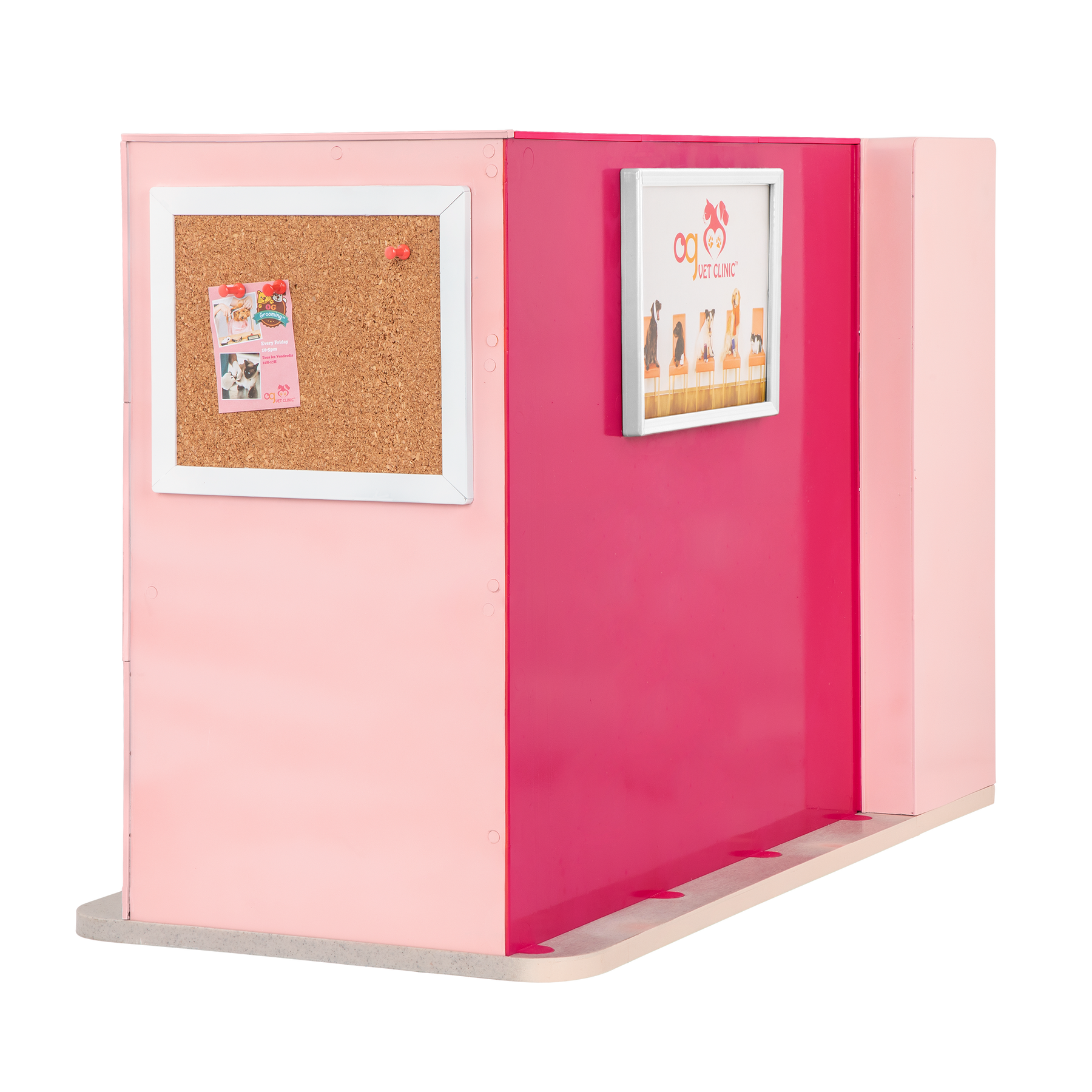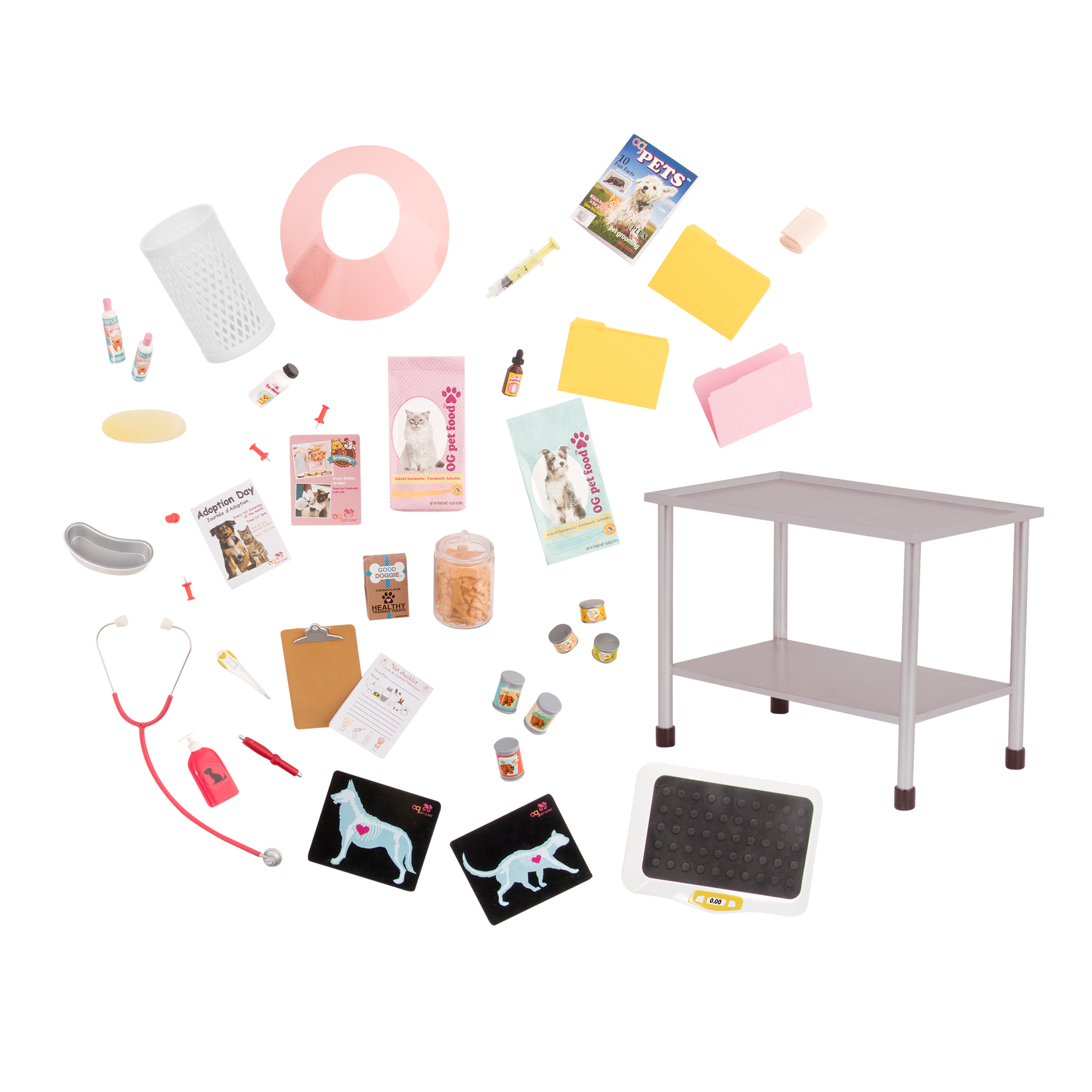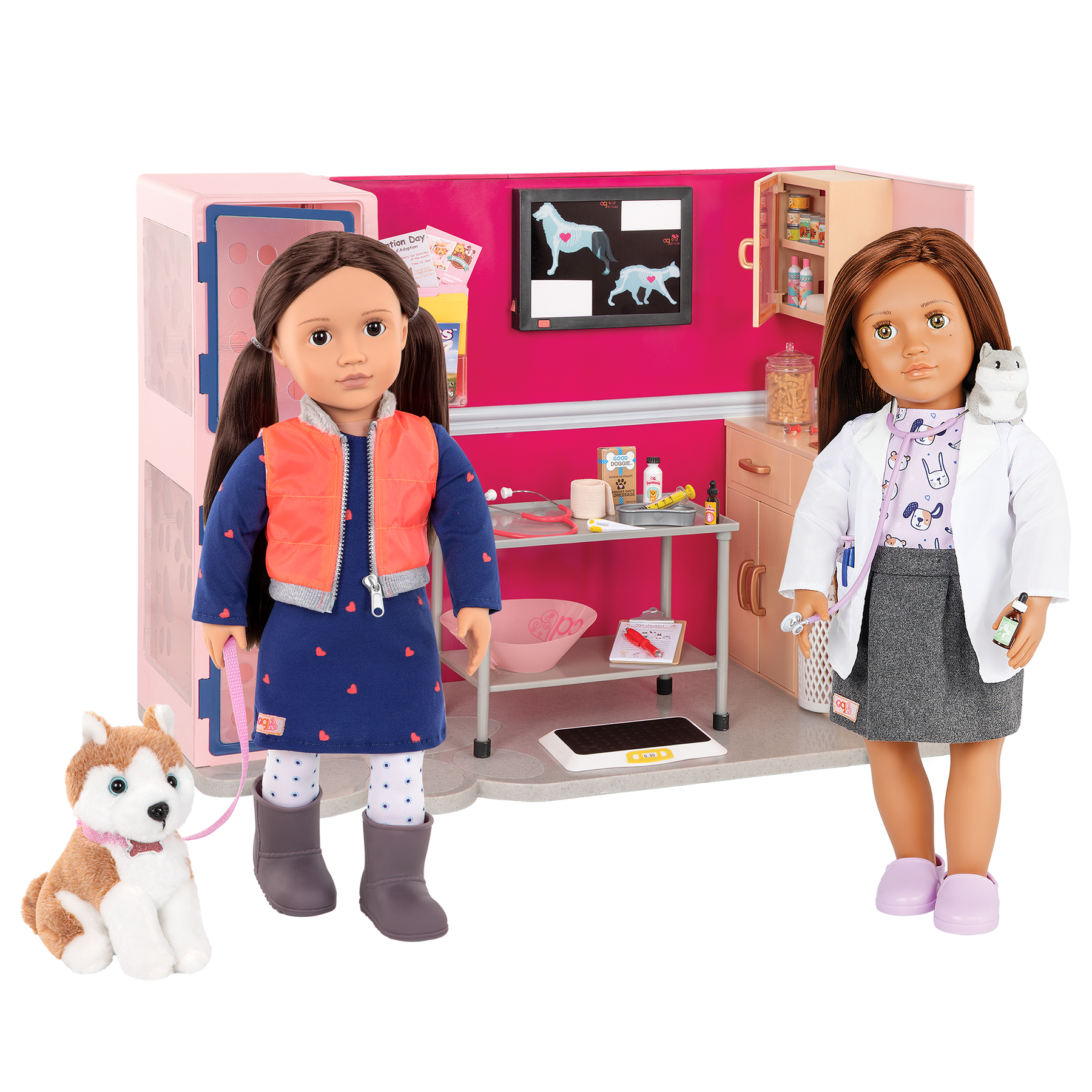 Keep your loyal pals happy and healthy from nose to tail with the Our Generation Healthy Paws Vet Clinic! This fully stocked, open-style playset is filled with realistic doctor accessories to help all your animal pals - from feathers to fins to fur! Browse the delicious treats or magazines on display until it's time for your pet's checkup. Then collect all the folders from the real cork board as you lead your pets into the exam room to play doctor with your favorite 18-inch dolls! Take x-rays with the light-up light box to scan your puppy pals for any injuries. And give your pups a quick recovery by having them stay overnight. They comfortably fit inside the 2 cozy kennels, and it will keep them safe and sound until your dolls can take them home the next day. The Healthy Paws Vet Clinic is sure to make tails wag with joy! (Dolls and pets sold separately)