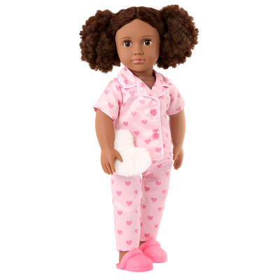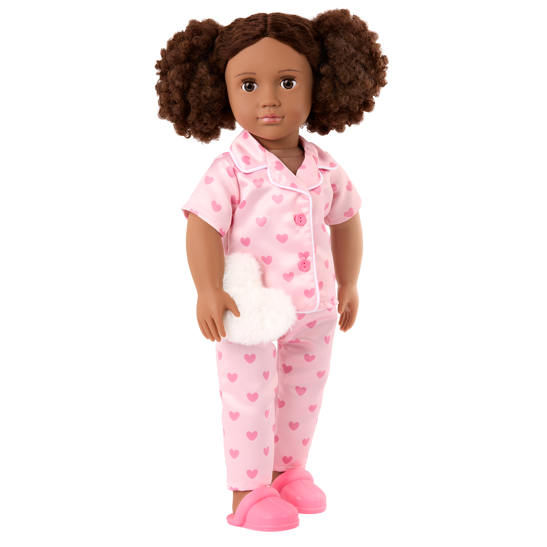 Fans of slumber parties can dream up bright stories with Our Generation 18-inch doll Lizbeth! Sleepover-ready, she arrives in cute heart-print pajamas with an ultra-soft plush pillow and slippers for a complete look. Lizbeth has a huggable soft body and lifelike features to delight doll fans during playtime. Her curly dark-brown hair is fun to style, and her beautiful brown eyes really close when it's time for sweet dreams! For dress-up fun, her outfit has easy-open closures to quickly put on and remove. So you can mix, match, and create more of your favorite looks! Our Generation dolls make a great gift for kids ages 3+ (small parts), encouraging them to imagine their own unique stories.