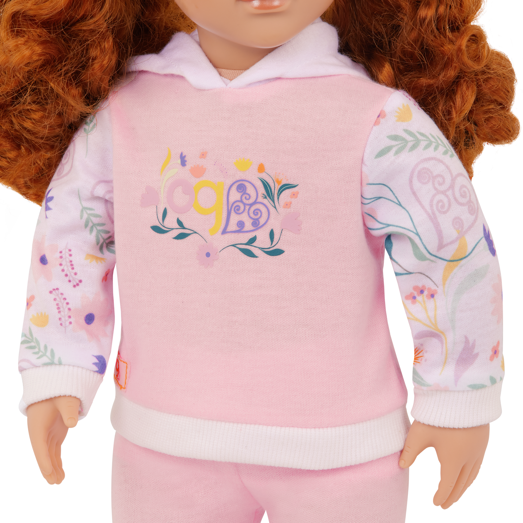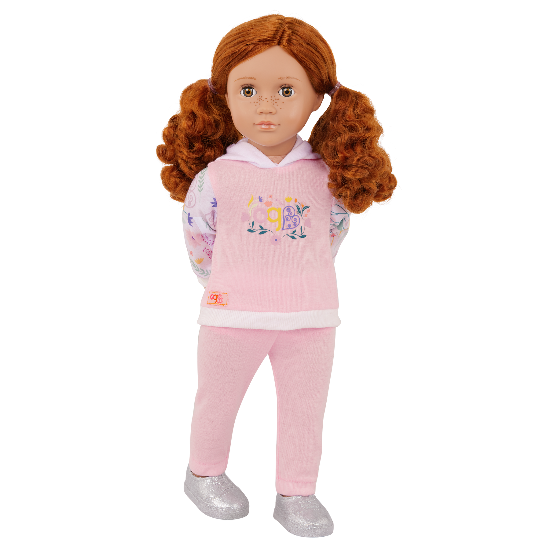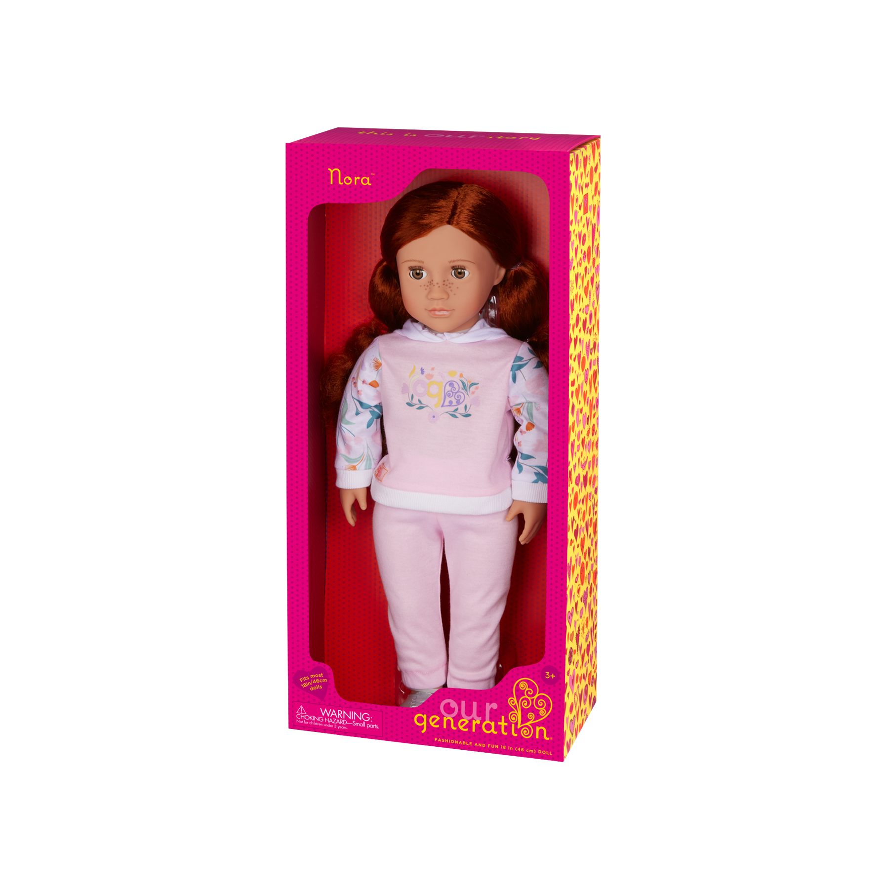 Our Generation 18-inch doll Nora is adventure-ready in her stylish outfit! She arrives wearing a sporty tracksuit with cute floral details and sparkly shoes. And she has a huggable soft body with lifelike features to delight doll fans during pretend play. Her long, wavy red hair can be styled in lots of fun ways, her eyes open and close, and she has cute freckles! When it's time for dress-up, Nora's outfit has easy-open closures to quickly put on and remove. So you can mix, match, and create more of your favorite looks!