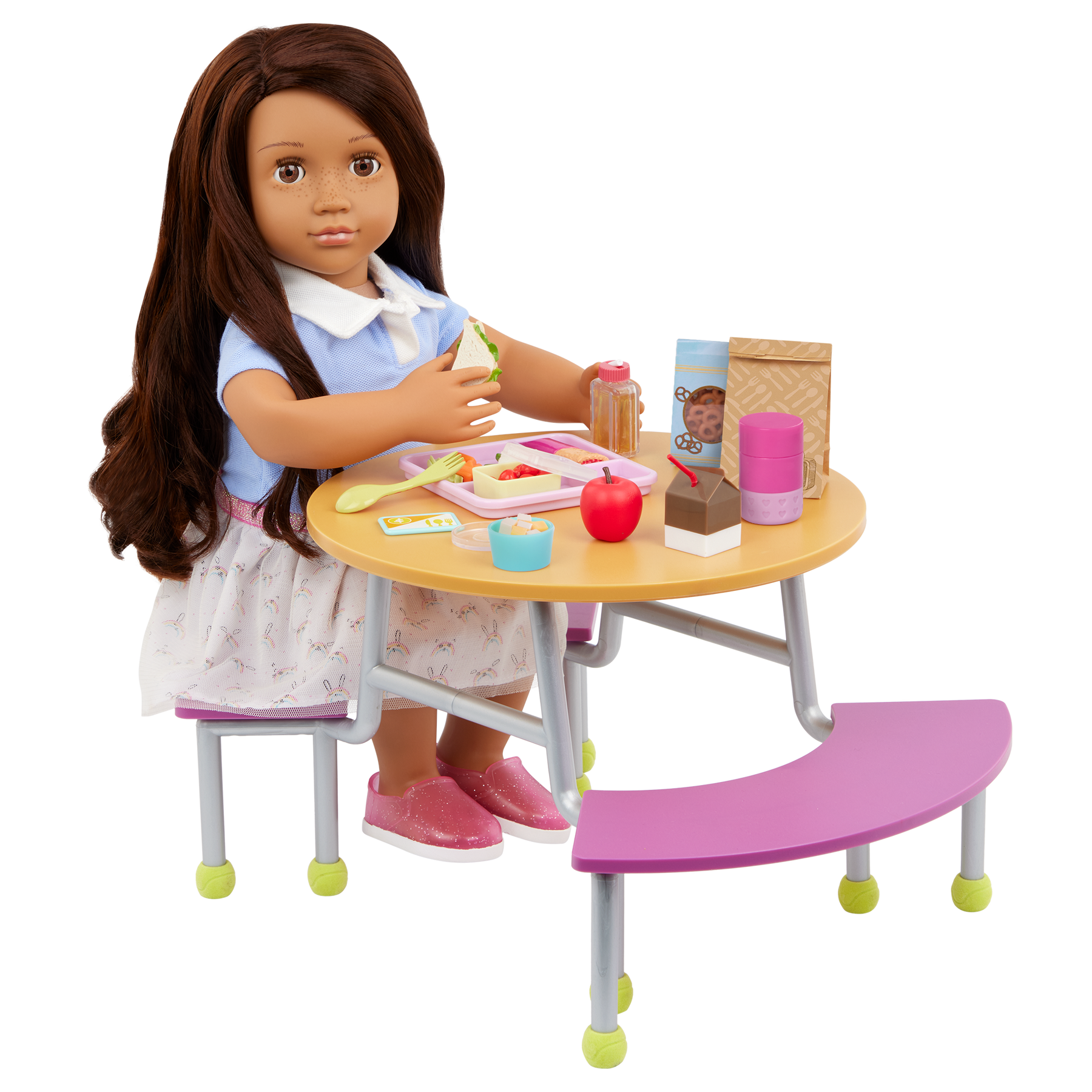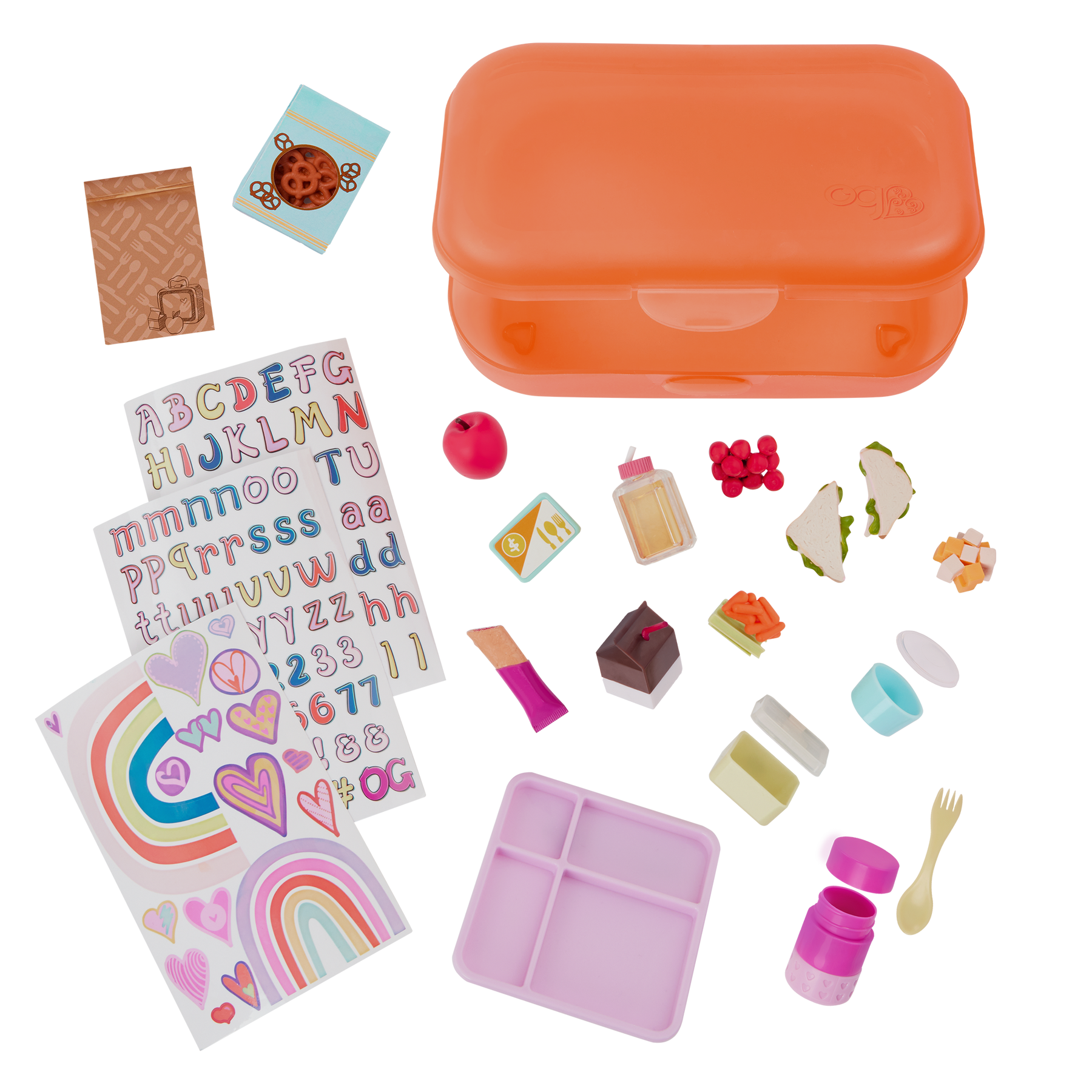 Unpack school day favorites with the Our Generation Ready for Lunch accessory set! Featuring over 20 play pieces, this 46 cm doll school set has everything kids need to explore hours of storytelling, including a storage case that doubles as a real pencil case for kids! Plus, this set includes 3 sticker sheets for added decorating and personalization. Use the cafeteria card to build a complete food tray with breakfast items like a cereal bar, apple, juice, and milk. The lunch bag will hold other items like veggies, 2 sandwich halves, pretzels, a thermos, and a spork until lunchtime. And mini storage containers let kids pack smaller items like tomatoes and cheese. Our Generation doll accessories make a great gift for kids ages 3+ (small parts), encouraging them to imagine their own unique stories. Makes a perfect addition to school sets and doll collections. Our Generation dolls sold separately.