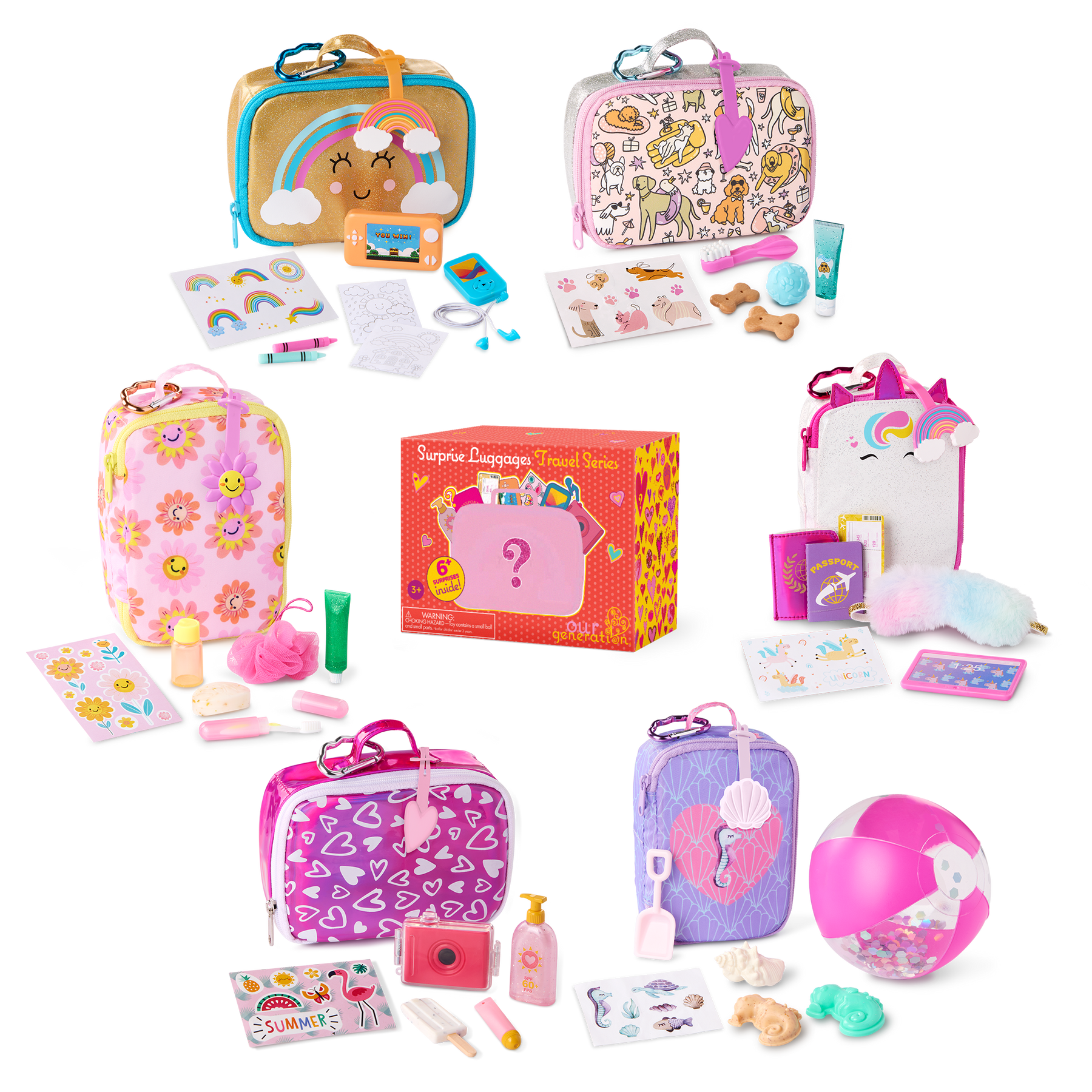 Unbox, unpack, and reveal fun mysteries with Our Generation Surprise Luggages – Travel Series! Each doll-sized luggage arrives as a surprise in mystery packaging for unboxing excitement, with an extra 6+ surprise toy accessories inside waiting to be revealed! Can you find the bonus unicorn pool float? It's hidden in 1 of 6 luggages wrapped in a special "surprise" bag! Look out for a rainbow, seahorse, hearts, unicorn, florals, and a friendly pet theme. Collect them all and check off each style in the collector's guide. Then, share with your favorite Our Generation dolls for more story-filled play! Includes 1 Our Generation Surprise luggage with 6+ travel accessories inside, featuring a variety of travel items and stickers to explore imagination in style. The surprise luggage is shipped at random. Our Generation dolls and pets sold separately.