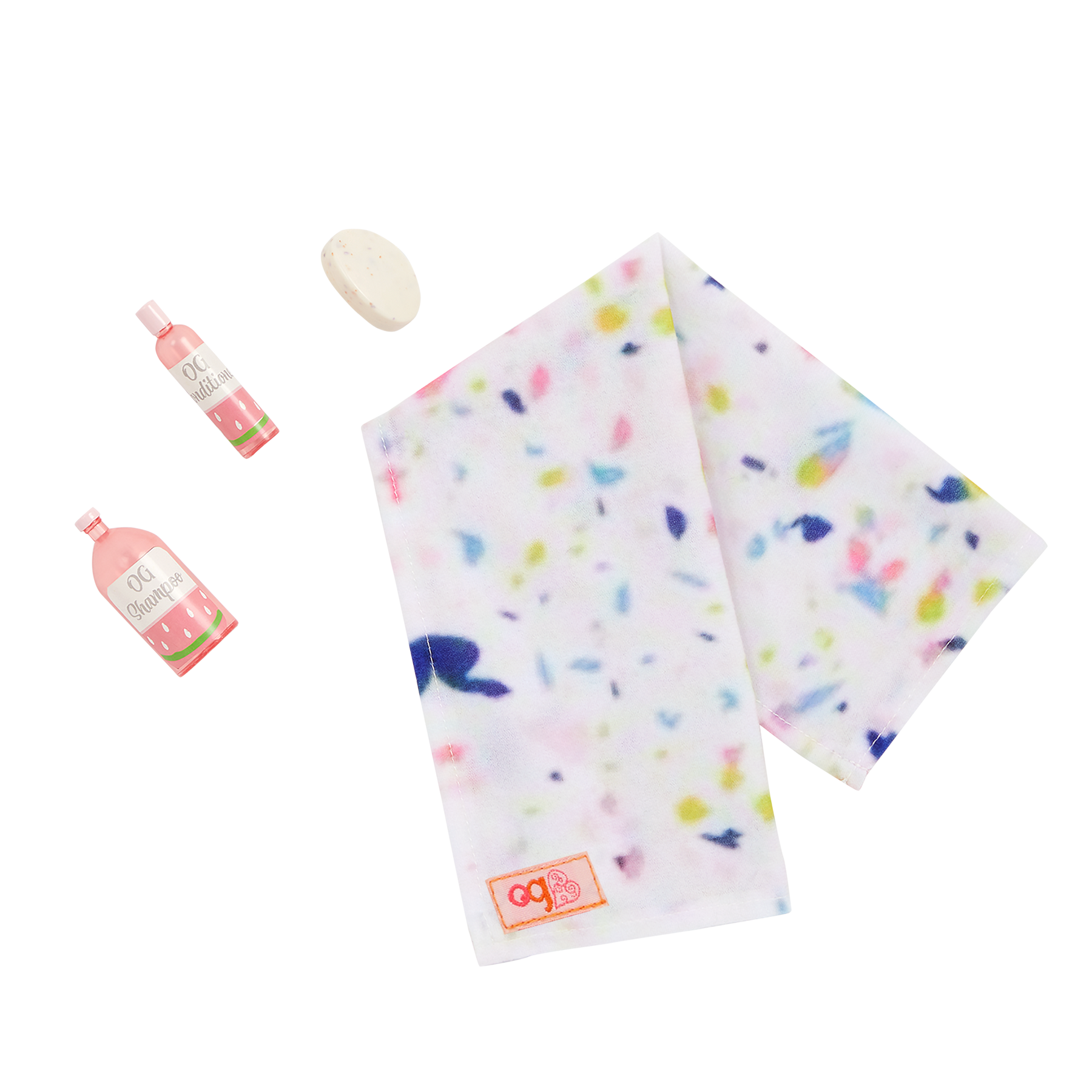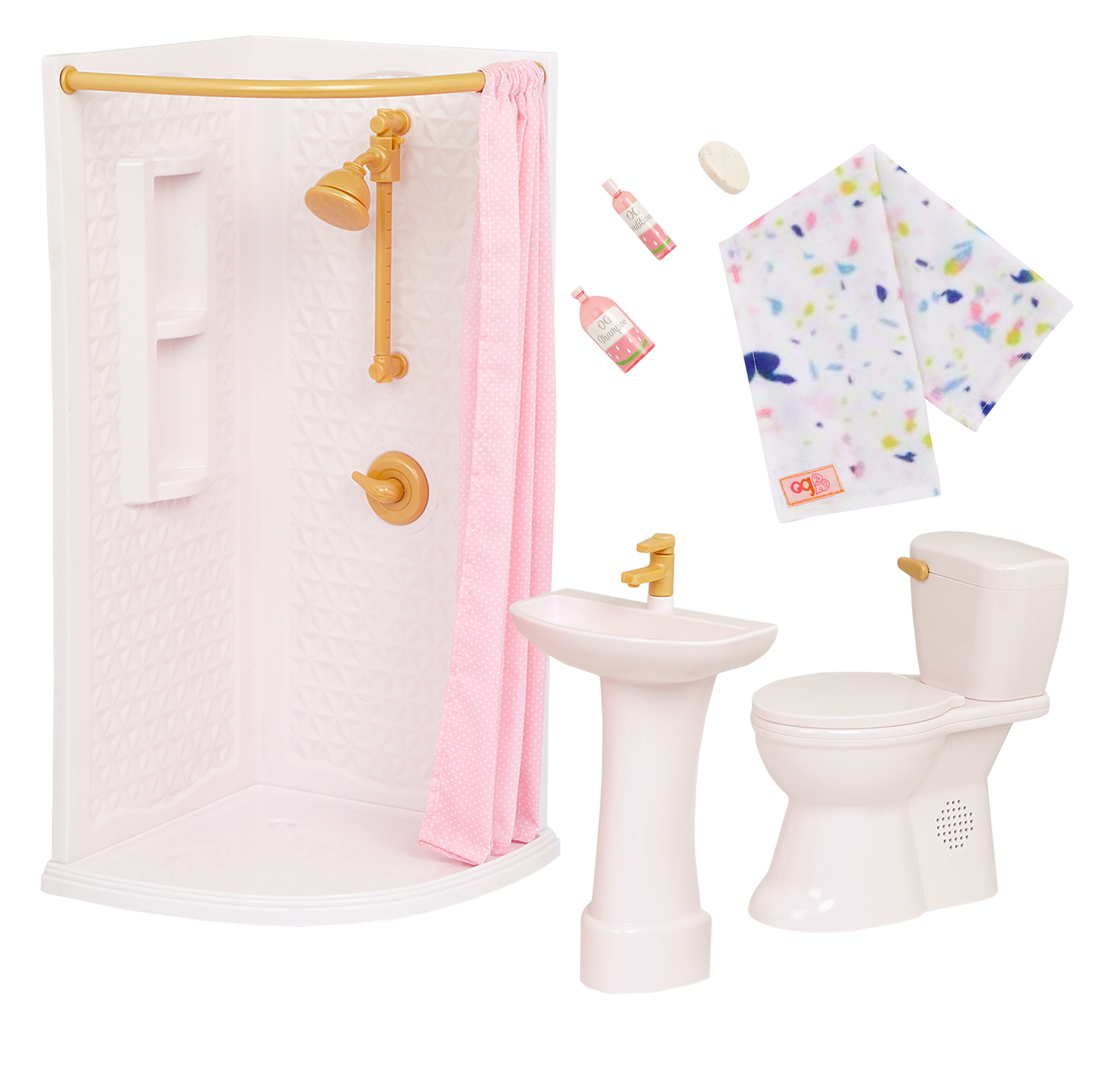 Make a stylish splash to your 18-inch doll's home decor with the Our Generation Sweet Bathroom accessory set! Featuring a doll-sized shower, sink, toilet, and toiletries, these movable pieces can be arranged and rearranged in your favorite play areas to create endless stories. The adjustable showerhead raises and lowers to accommodate dolls and pets, and the curtain slides closed for added privacy. The toilet even makes a fun flushing sound when you press the handle! For added storage, the shower has 2 interior shelves to hold the shampoo and conditioner bottles. And the hand soap dispenser neatly fits on the sink to keep your new bathroom tidy! This complete bathroom set is compatible with most 18-inch dolls, dollhouses, and furniture sets. Dolls sold separately.