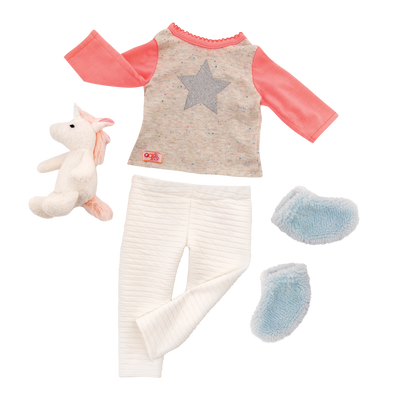 Bring a sprinkle of magic to your doll's dreams with the Our Generation Unicorn Wishes pajama outfit for 18-inch dolls! This comfy and cute doll pajama set is sure to provide sweet sleep to any doll, whether it's at a doll sleepover or just time for bed. The long-sleeved pink and gray pajama top will keep your doll cozy through the night, and the white pajama leggings easily go from bed to the breakfast table! The cozy, fuzzy slippers are perfect for late night trips to the kitchen for a sip of water. And best of all, the doll-sized plush unicorn toy will cuddle up with your doll all night and bring just a little magic to her slumber! (Dolls sold separately)