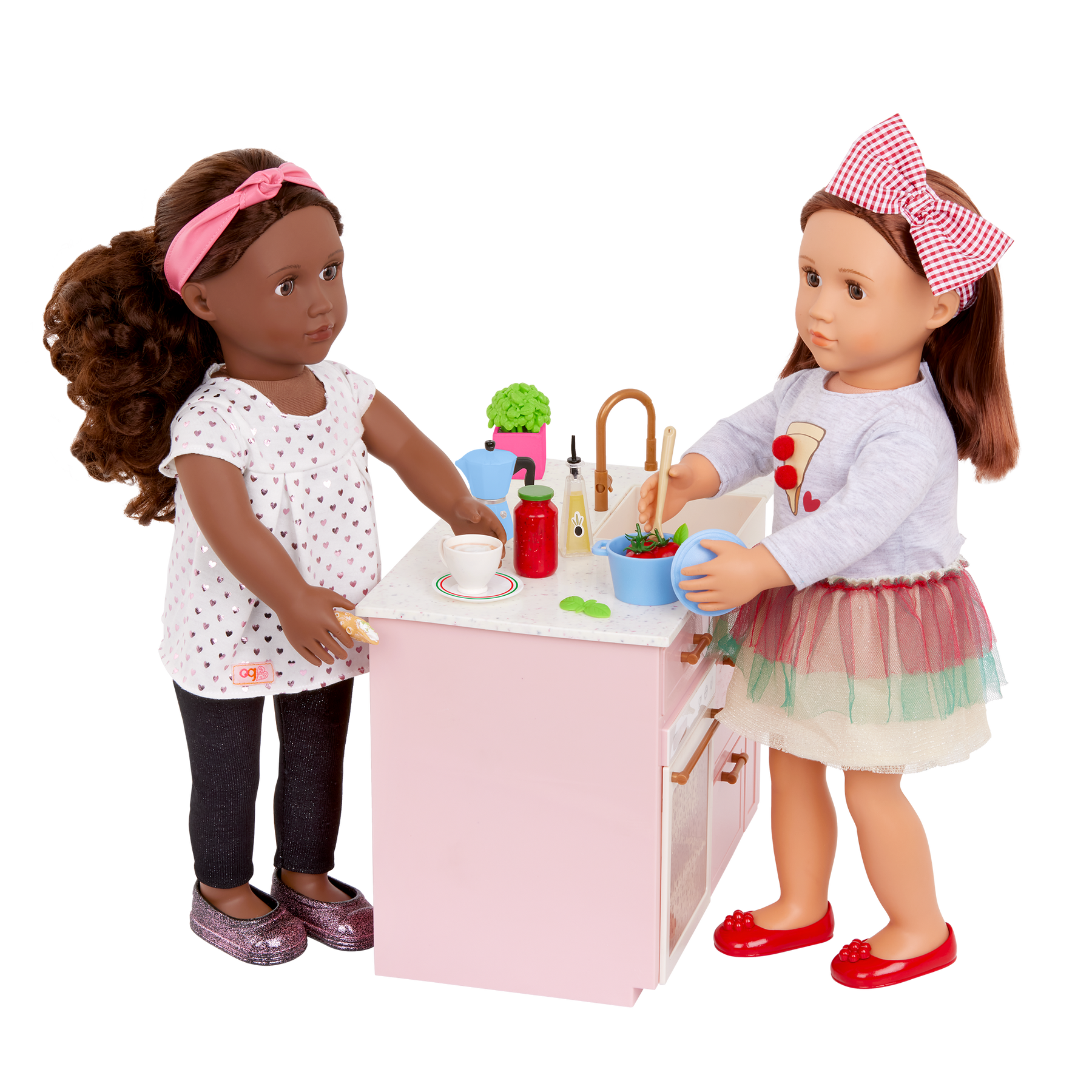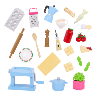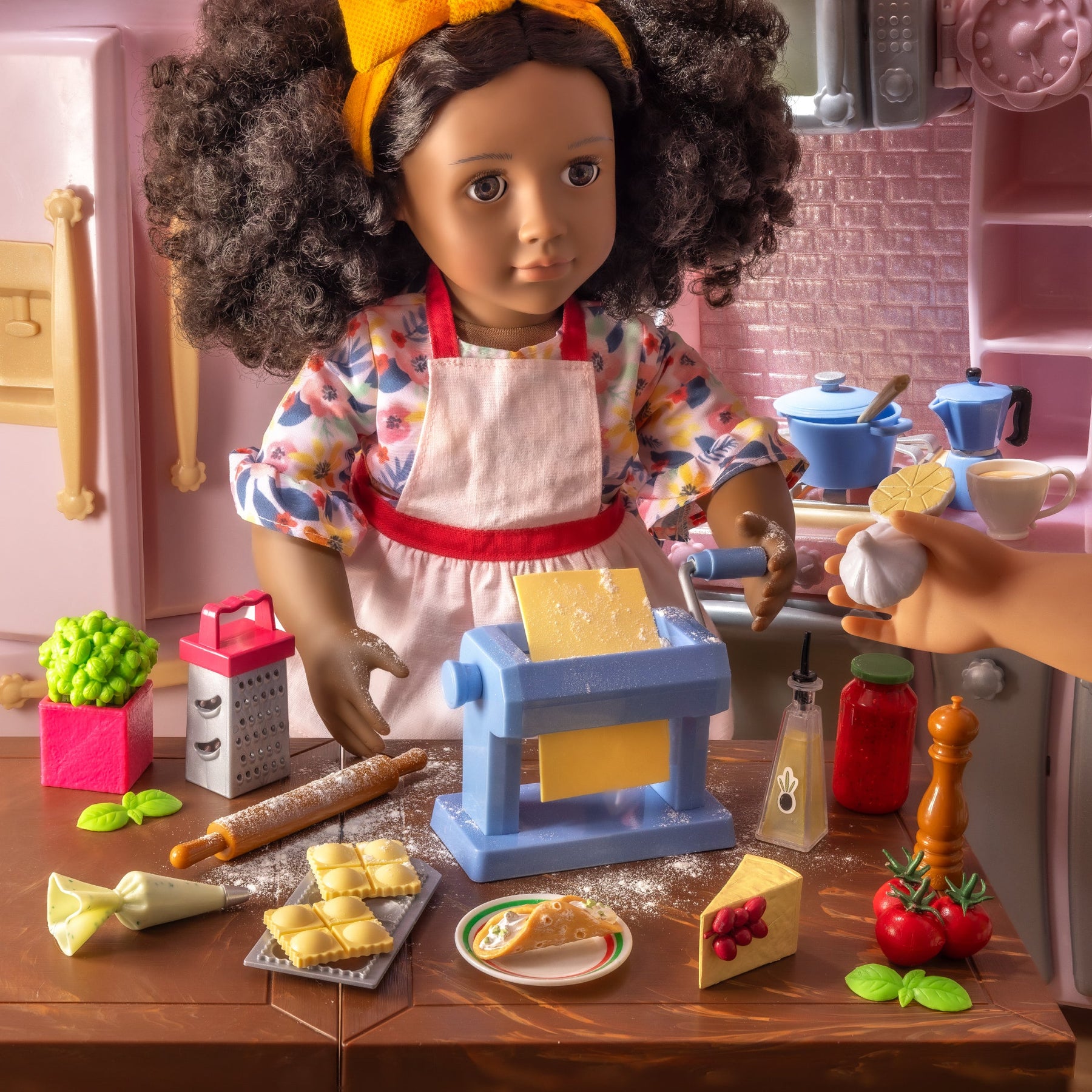 Playtime pasta-bilities are endless with the 24-pc Our Generation Pasta Party set! Before the meal is ready, there's a whole lot of cooking fun to explore. Little chefs will learn how to make homemade pasta with a rolling machine that really turns! Just insert the pasta sheet and crank the handle - PERFECTO! Detailed play food accessories in bright colors create engaging meal prep. Plus, kids will love mixing and matching these pieces with other pretend food sets to spice up their playtime menus. It comes complete with pasta-making ingredients as well as cute kitchen items like a salt mill, cheese grater, and traditional espresso maker. Compatible with most 18-inch dolls and accessories. Our Generation accessories make a great gift for kids ages 3+ (small parts), encouraging them to create their own unique stories. Dolls sold separately.