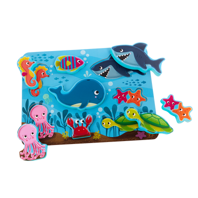 Dive into fun with the Peek & Explore Under the Sea puzzle from B. toys! This wooden puzzle is chunky, matchy, and it includes 8 easy-to-hold pieces that feature a whale, shark, fish, octopus, seahorse, crab, starfish, and a turtle. As children lift up each puzzle piece, they’ll discover a matching illustration right underneath! Not only does this puzzle come with tons of fun, it also teaches kids about different kinds of sea animals, improves their fine motor skills, and develops their problem-solving skills. Discover the full Peek & Explore collection from B. toys to find more colorful puzzles for the little one in your life! Recommended for children 2 years and over.