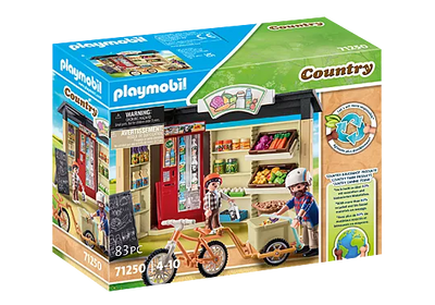• The 83-piece PLAYMOBIL toy set includes two PLAYMOBIL figures, a farm shop with milk vending machine, eggs, fruits, vegetables and various other food items.