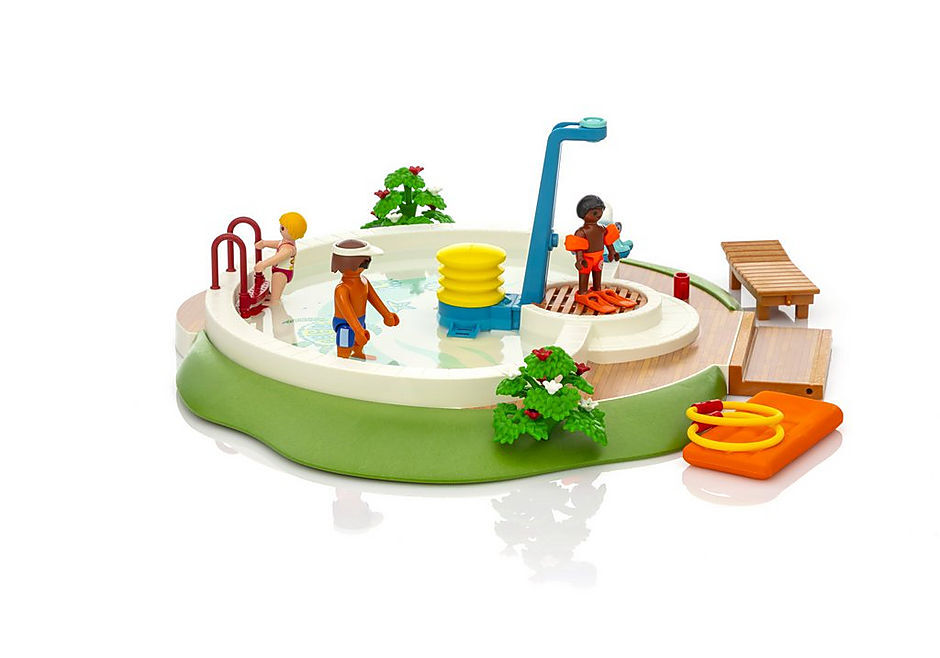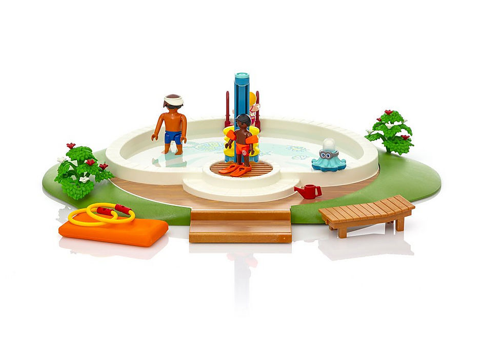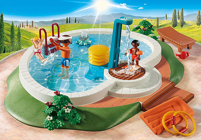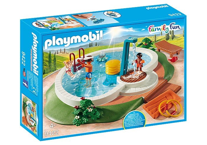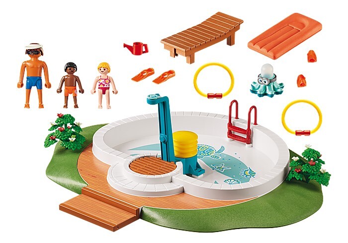 Box contains: Figures: 1 man, 1 boy, 1 girl; Accessories: 1 swimming pool with shower, 1 lounger, 1 pair of fins, 1 watering can, 1 water spray octopus, 1 air mattress, 2 swimming noodles, 1 pair of water wings, 1 sun cap.