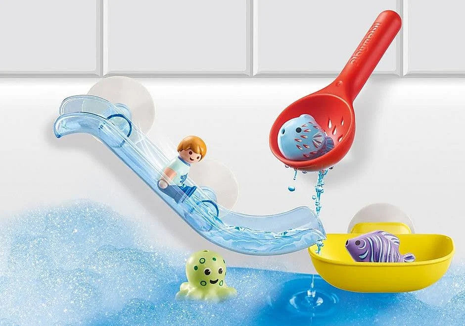 Slide into bathtime fun with the Water Slide with Sea Animals. First, attach the slide and bowl to the wall or side of the tub using the suction cups. Then, let the fun begin! The fish and figure and zoom down the slide and into the water or bowl. Once everyone has had a turn, use the slotted scoop to retrieve the fish and figure before going again! Want to make a game out of it? See how many pieces you can catch in the bowl!