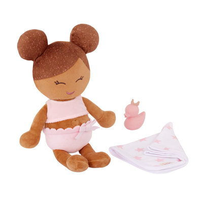Bring baby doll in the water! Kids who love water play can enjoy bathtime fun with the LullaBaby bath doll. This unique 14" bath doll is made of ultra-soft, water-safe plush for little ones to cuddle, love, and bring in the tub. Plus, this set includes cute bath toys like a star-print towel and pink bath ducky for added imaginative play. To dry, gently squeeze water out of the bath doll and tumble dry on low. LullaBaby dolls encourage children to develop empathy, kindness, and caring qualities as they play and grow with their dolls.