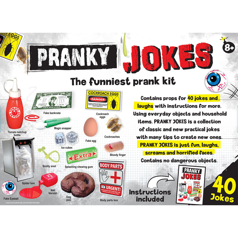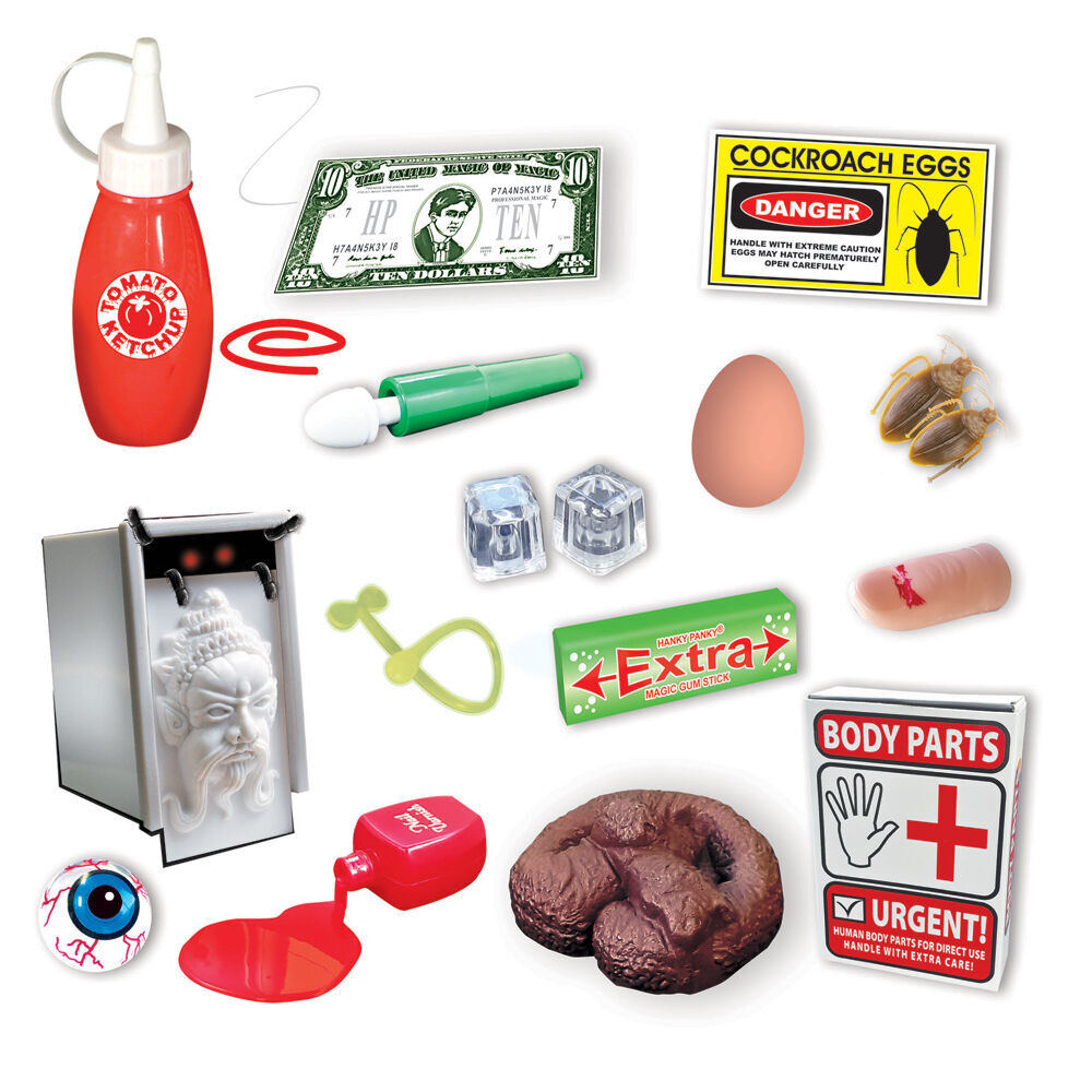 Contents: Appearing spider Dog Poo, The Magic Snapper, Floating Eyeball, Ice Cubes with Flies' Tomato Ketchup Bottle, Smashed Egg, Body parts box, Cockroaches, Cockroach Eggs, Snotty Snot, Bloody Finger, Money that, you can't get, Spiled Nail Polish.