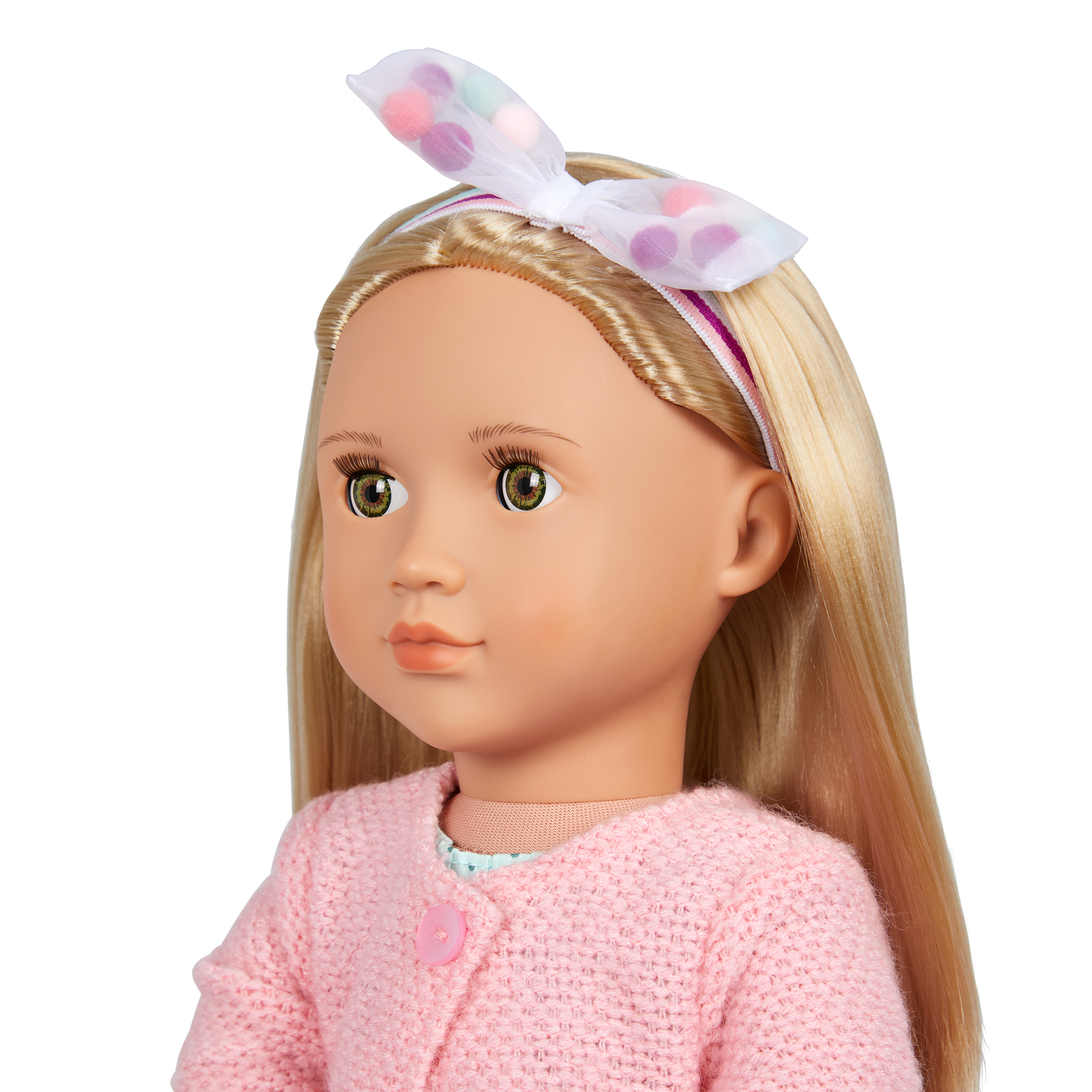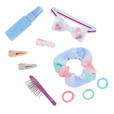 Add fun looks to any hairstyle and outfit with the Our Generation Pretty Pom Poms set for 18-inch dolls and kids! Featuring 3 colored hair elastics, 3 cute hair clips, a hair bow headband, and a rainbow scrunchie, this set is perfect for adding a parade of pom poms to any creative hairstyle. Use each styling piece on your doll's pretty ponies, twists, braids, updos, and more. Then share the look by adding them to your own hairdos for double the styles! The spray bottle and wire brush will keep your doll's hair soft and tangle-free for comfortable styling, and it's perfectly sized to complement most 18-inch dolls, outfits, and accessories. (Dolls sold separately)
