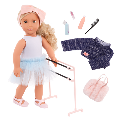 Take the stage and shine in the spotlight with Our Generation doll Prima! This 18-inch ballerina doll has a huggable soft body and lifelike features to delight doll fans during playtime. Her beautiful hazel eyes open and close, and her curly, light-blonde hair is fun to style! Prima arrives wearing a cute pullover top, a ballet dress with a tulle skirt, a large headband, and ballet shoes. Plus, she comes with bonus accessories for kids to prep Prima before her recital. This set includes a comb, a bottle of hairspray, pretend lip gloss, a workout bag, a water bottle, and a ballet barre to create a mini dance studio! When it's time for dress-up, her outfit has easy-open closures to quickly put on and remove. So you can mix, match, and create more stylish looks on any adventure! Our Generation dolls make a great gift for kids ages 3+ (small parts), encouraging them to imagine their own unique stories.