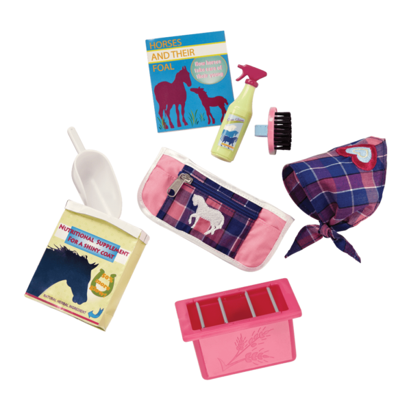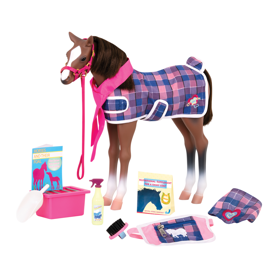 Sometimes the sweetest friends come in small sizes, like the Our Generation Quarter Horse Foal! This charming 12-inch baby horse toy is the perfect companion for 18-inch dolls who love horses! The Quarter Horse Foal has a brown body with white "socks" on its legs, and a dark brown mane and tail. Practice giving your foal different hairstyles. The silky-soft hair is fun to brush! Dress the foal in a cozy and cute plaid blanket wrap. The matching plaid scarf and fanny pack for dolls will let them be twinsies for the day! The assortment of grooming and feeding accessories will help your doll take extra-good care of their foal. Discover all of the great items in the Our Generation Equestrian Collection for even more fun accessories to pair with your foal! (Dolls sold separately)