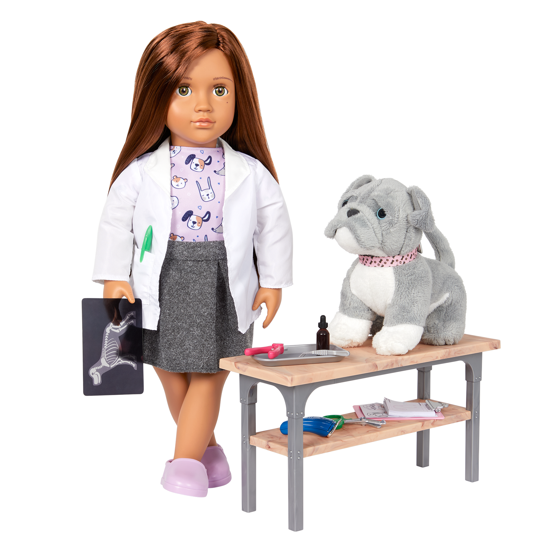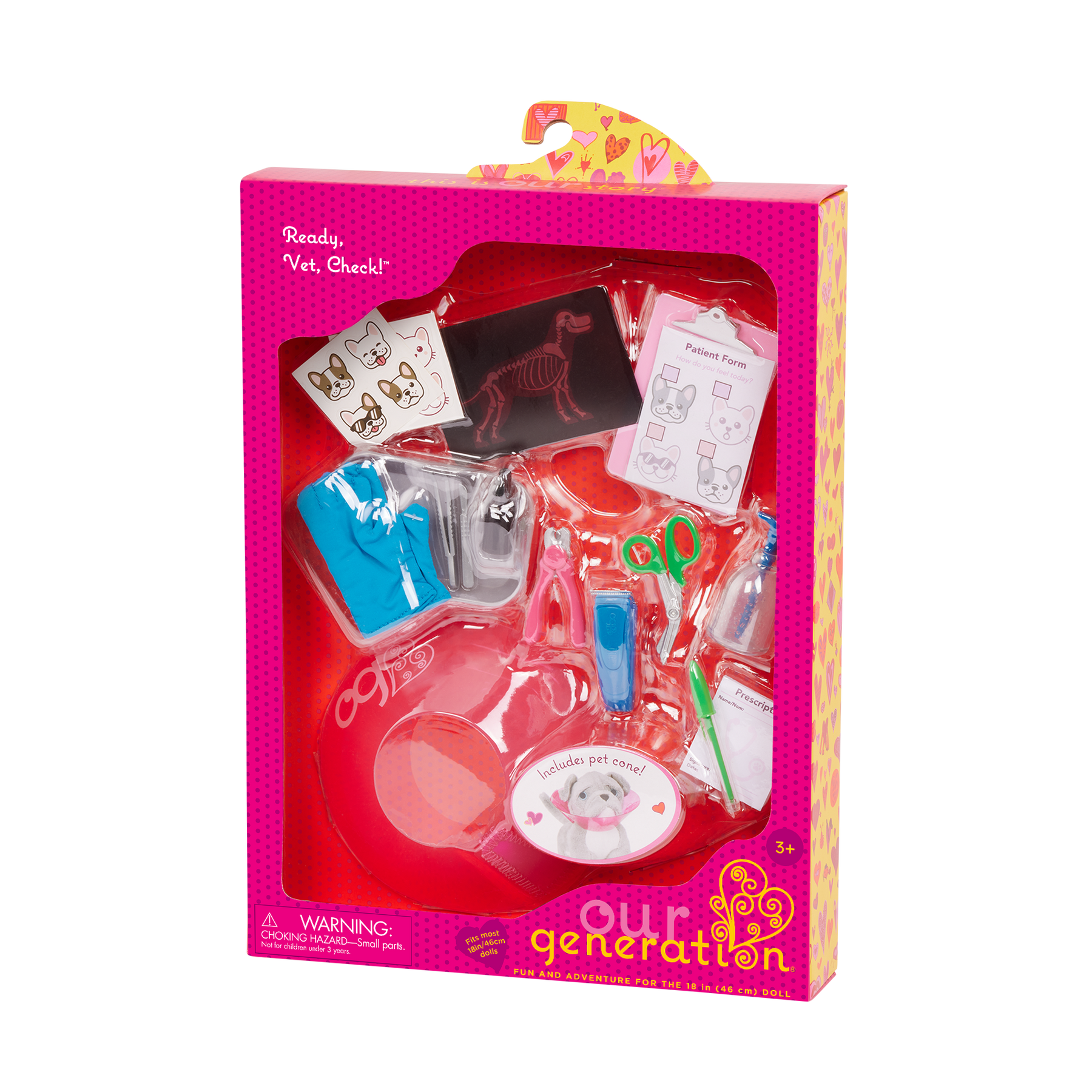 Give pets and animal friends fun checkups from nose to tail with the Our Generation Ready, Vet, Check set! Prep your doll vets with the medical gloves before the examination begins - just like a real doctor does! Does your patient have an injury? Check the x-ray sheet and help them heal with the pet cone. It easily fits all Our Generation 6-inch pets! Realistic accessories include a prescription pad, medical shears, tweezers, pretend scalpel, nail clipper, hair clipper, hand sanitizer and a bottle of ear drops. And additional pieces like a pen, clipboard, tray, patient chart, and 2 sticker sheets provide extra engagement during creative storytelling! (Dolls, pets, and table sold separately)