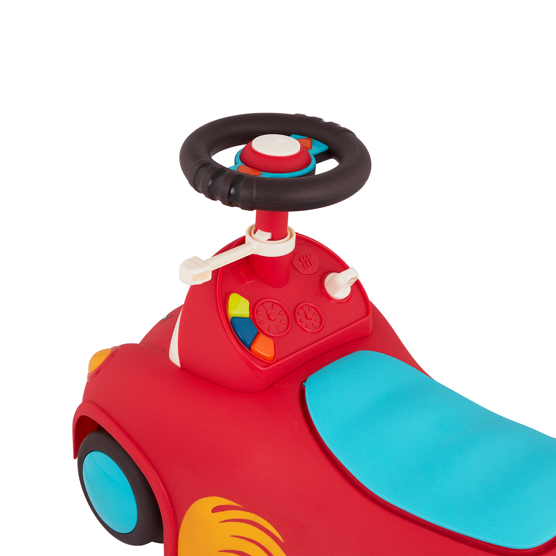 Push, scoot, store, and play with Freddy Zoom – one of the Rollin' Riders from B. toys! This ride-on race car features a kid-friendly design, songs, sounds, lights, an easily-removable handle, and secret storage space. Before rollin' off on an adventure, pack your tiny treasures in the storage space right underneath the seat. Then hop on and ride into fun! As you scoot around the room, press the button on the speedometer to play 1 of 5 fun songs, then pull the gear up or push it down to activate the blinkers and fun sounds. Not only does this colourful ride-on encourage active play, but it can also improve a toddler's motor skills. 3 AA batteries are required and included. Recommended for children 12 months and over.