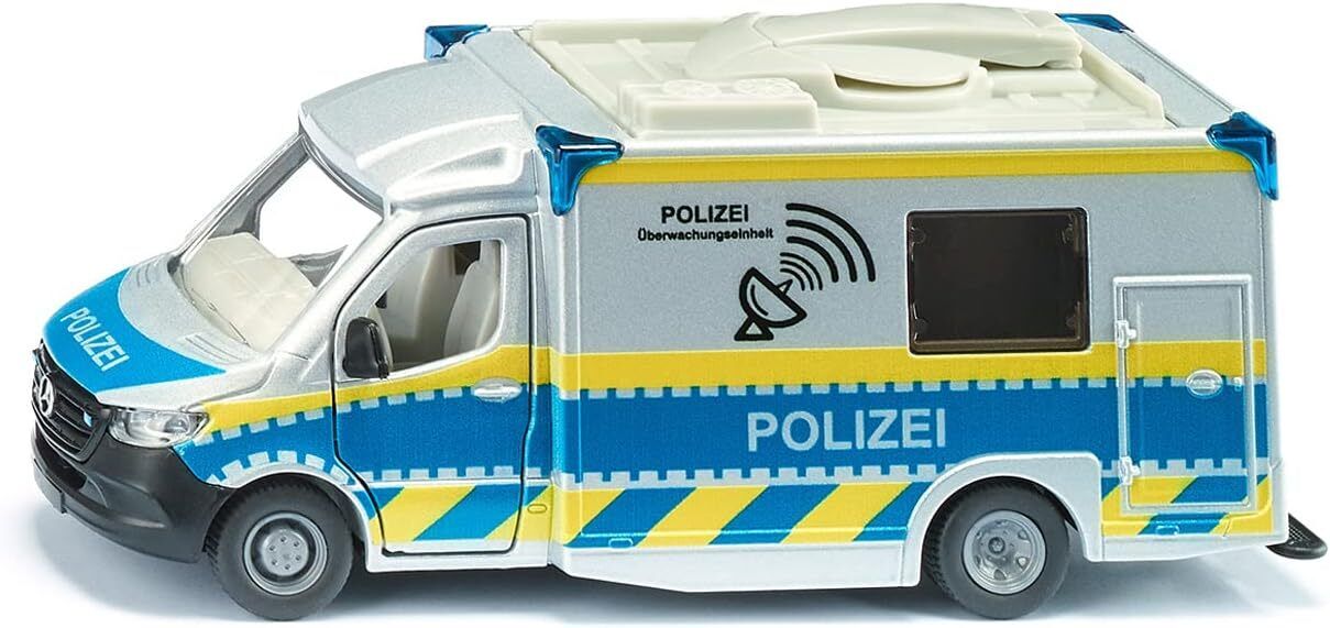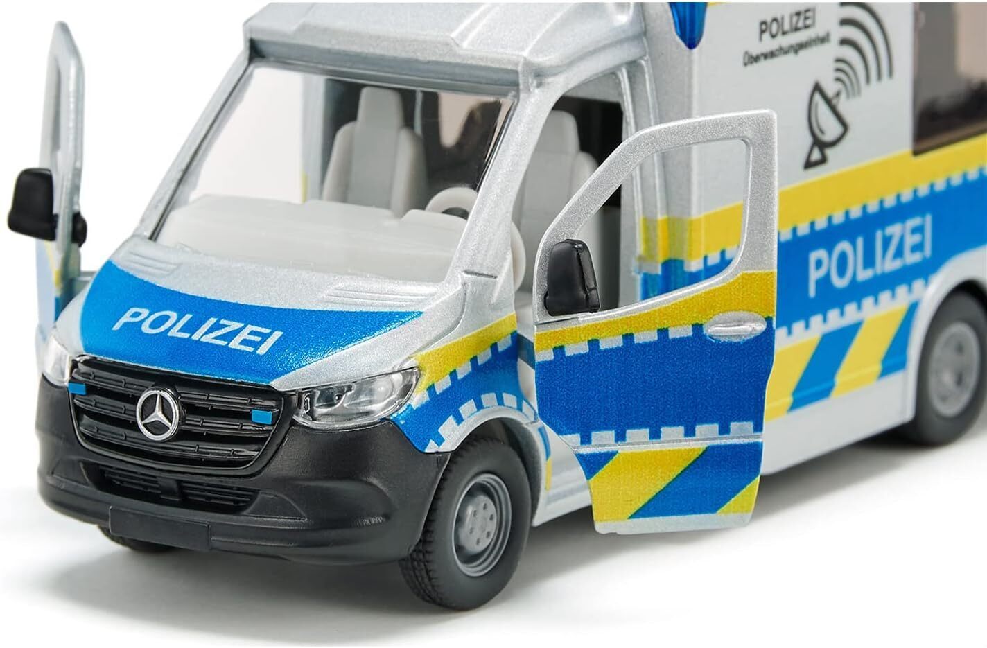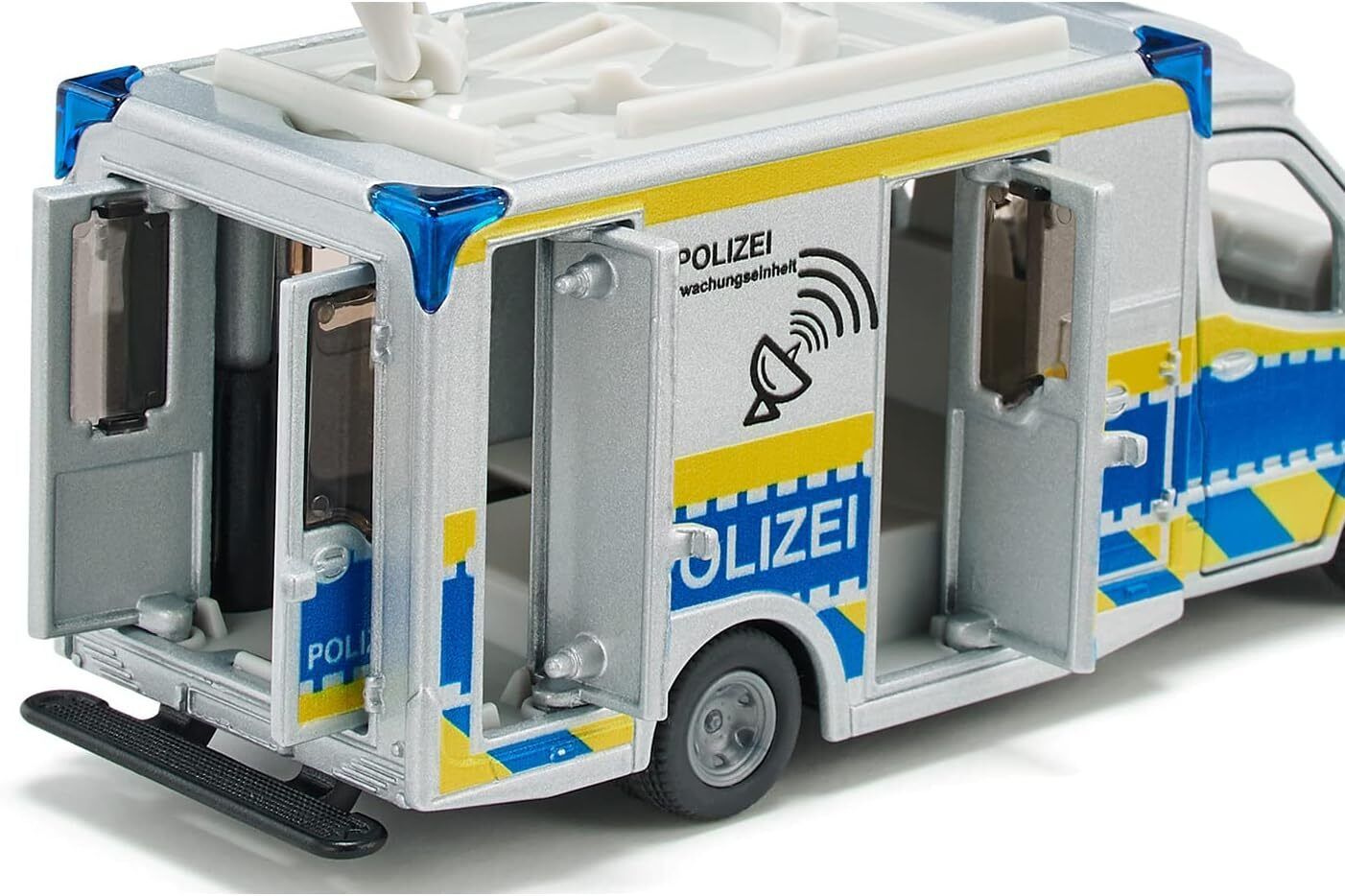 The siku police Sprinter from Mercedes-Benz has a rotating satellite dish on the removable roof to provide the necessary equipment in crisis situations. The dish can be folded in for the journey to the scene of the incident. To get inside the police vehicle, the doors on both sides of the driver's cab can be opened, as well as two doors each at the rear and on the passenger side.