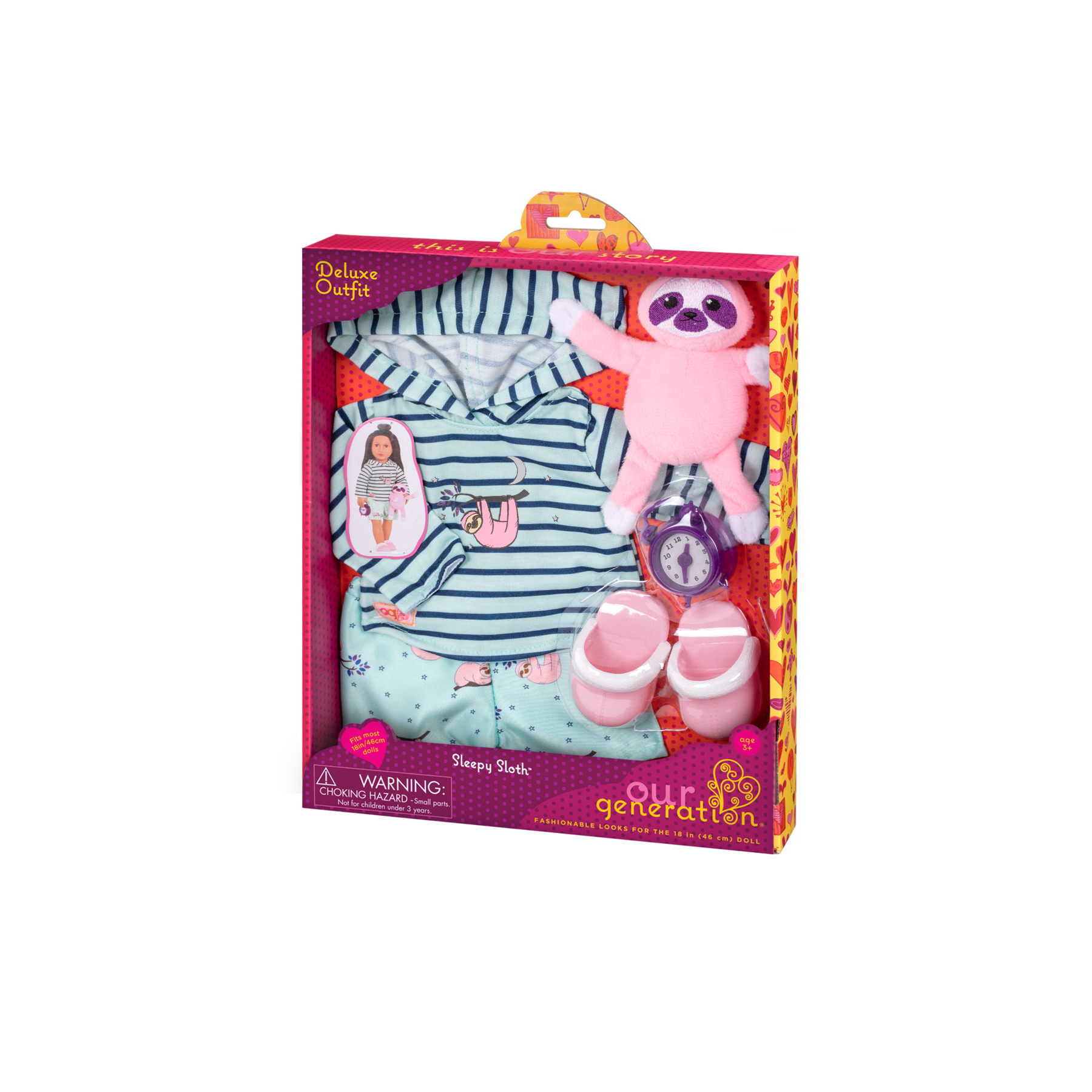 Tuck your 18-inch dolls in for sweet dreams with the Our Generation Sleepy Sloth outfit! The striped, long-sleeved shirt with a hoodie has a cute pink sloth on the front, and the adorable pajama shorts are full of sweet sloth designs. The comfy slippers will keep your doll's toes warm, and the plush sloth is the perfect sleeping buddy. It even comes with an alarm clock that lets you change the time with the dial, so you can let your dolls know when it’s time to get up. This outfit has easy-open closures that make it fun to mix and match with other colorful Our Generation selections, so your doll can start her day with creative style! (Dolls and additional outfits sold separately)