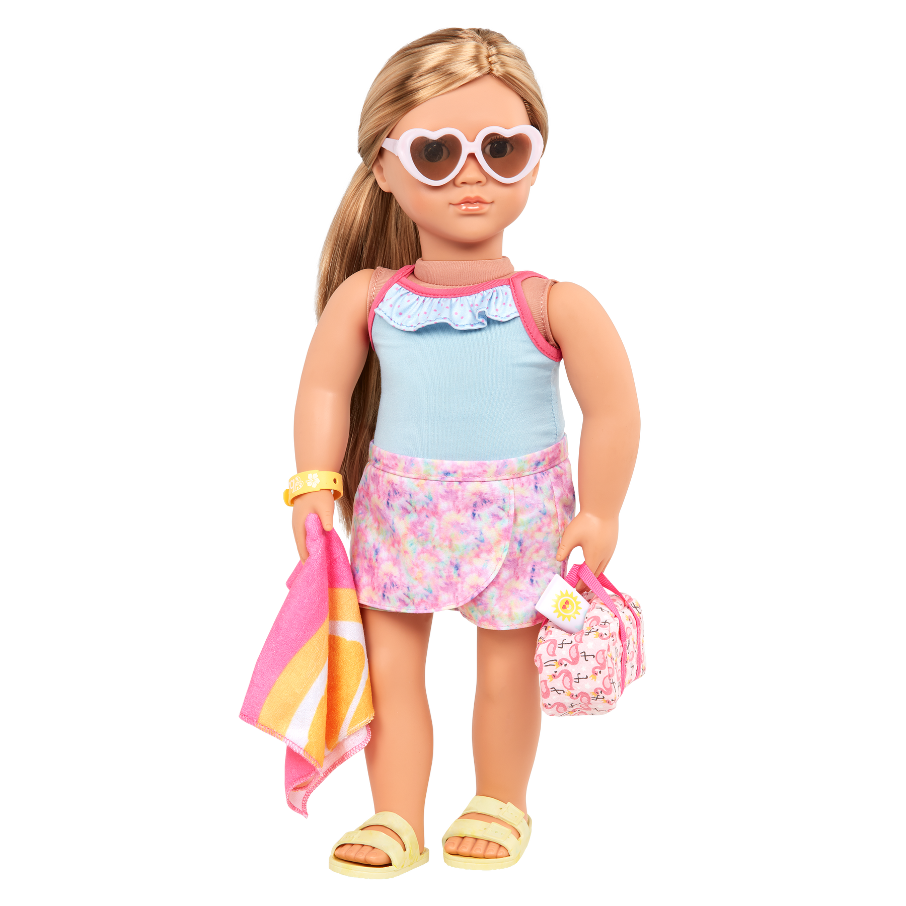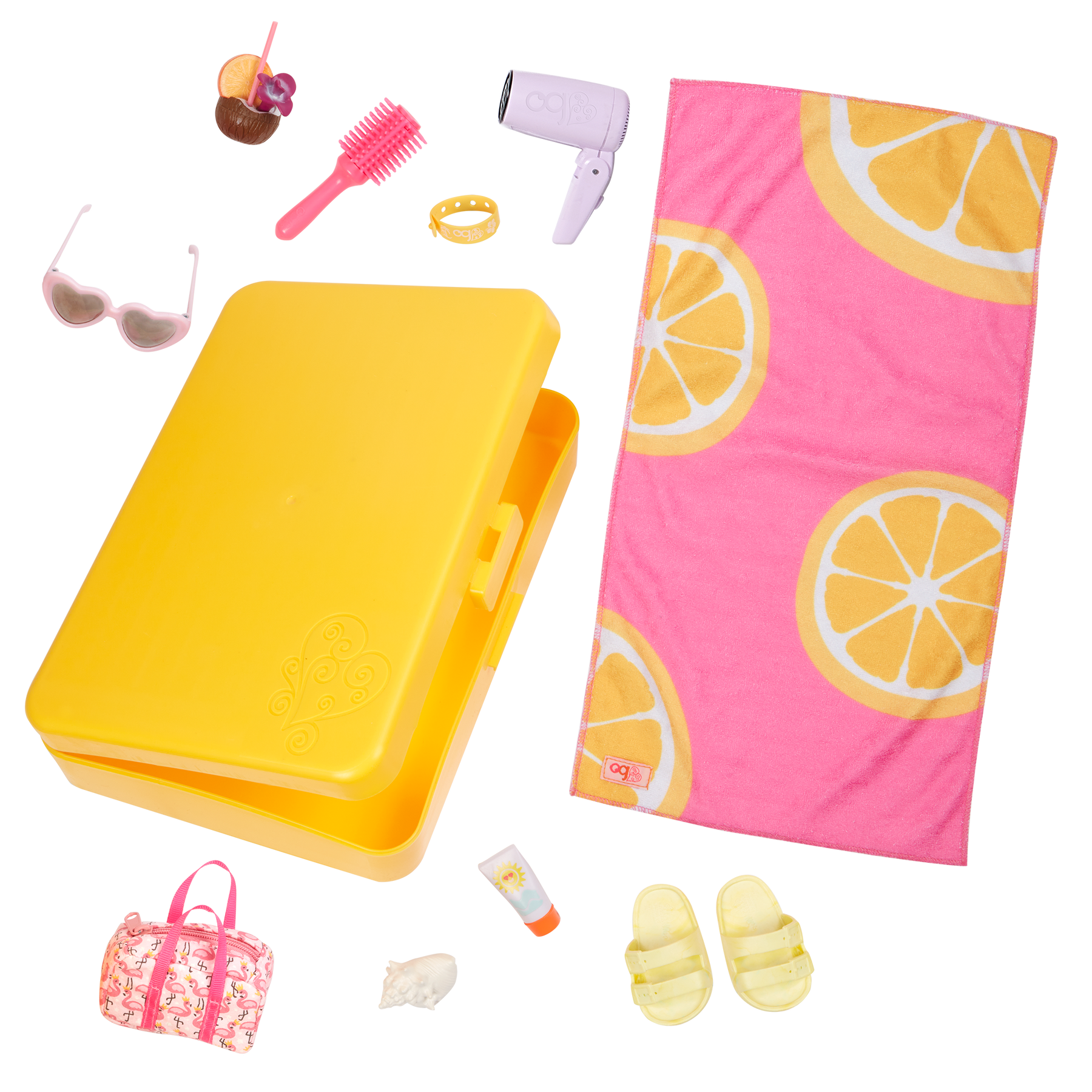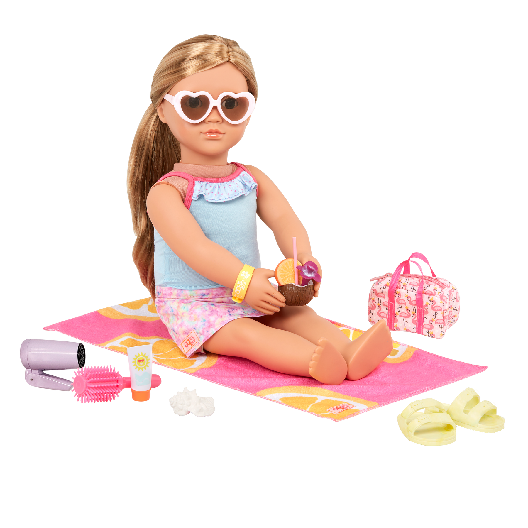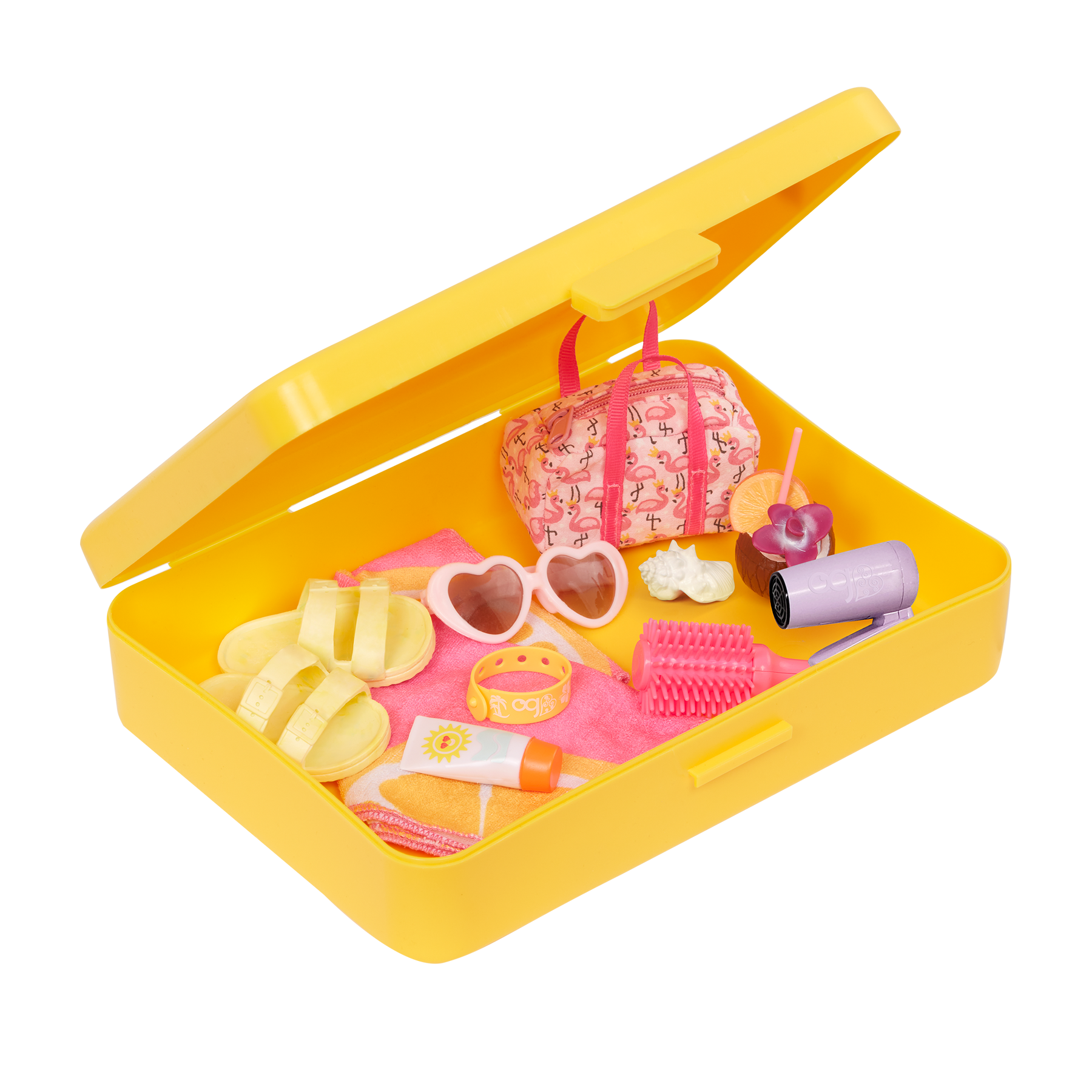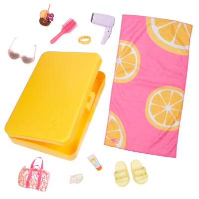 All packed and ready to go! Little globetrotters will have a blast sending their 18-inch dolls on fun adventures with the Our Generation Start a Journey set. Open up the travel case to reveal travel essentials, including a foldable hair dryer that makes a realistic sound, a hairbrush, a travel bag, a resort bracelet, and coconut water. And the additional beach accessories like a towel, pair of sandals, sunglasses, sunscreen, and a seashell let explorers soak up the sunshine! This accessory set is compatible with most 18-inch dolls and accessories. Dolls sold separately.