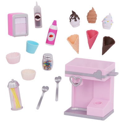 Serve up sprinkles, fudge, and everything fun with the Our Generation Sundae Fun Day set! This ice cream machine set has all the ingredients for ice cream lovers to complete their 46cm doll's ice cream shop or make sweet treats right from their kitchen! Kids can pull the lever to hear a fun sound as they prep each dessert. And they can use the 3 toy ice cream swirlies to fill the waffle cones and bowls! Cute parlor items like the jar of straws and napkin dispenser add an extra sweet touch. While the sprinkle shaker, whipped cream and chocolate syrup bottles let them add pretend toppings. The Our Generation Sundae Fun Day ice cream machine is the perfect gift for kids ages 3+ (small parts). Compatible with most 46cm dolls and accessories. Dolls sold separately.