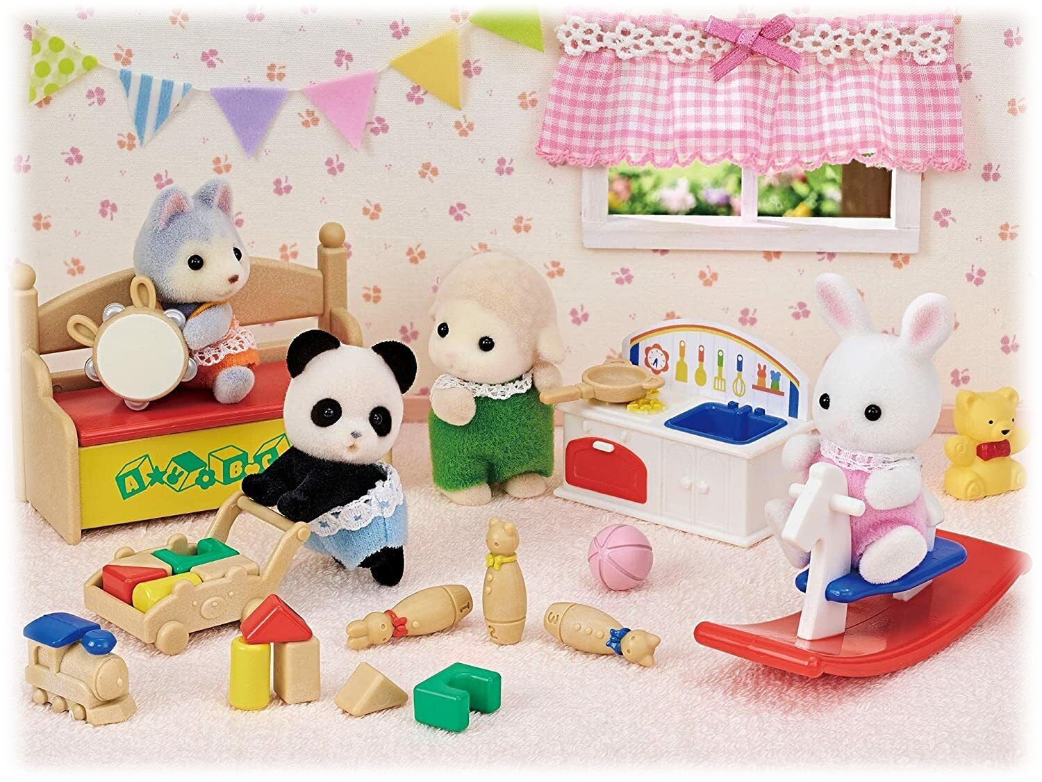 This colourful set includes Snow Rabbit and Pookie Panda, plus an opening toy box, play kitchen, rocking horse and a host of extra toys to play with too.