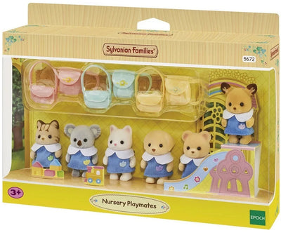 A collection of six adorable baby figures, each with their own nursery school uniform and bag. The fabric clothing can be removed to change the figures' outfits.