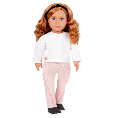 Discover cute fashion and celebrate individuality with Our Generation 46cm doll Teagan! She has a huggable soft body with unique child-like features that make her stand out, from her bright blue eyes that open and close to her wavy red hair and adorable freckles! Teagan arrives wearing a casual top, bright pink pants with ruffle accents, and a headband to accessorise her hairstyles. Her outfit also has easy-open closures to quickly put on and remove. So you can mix, match, and create more fun fashion looks for Teagan!