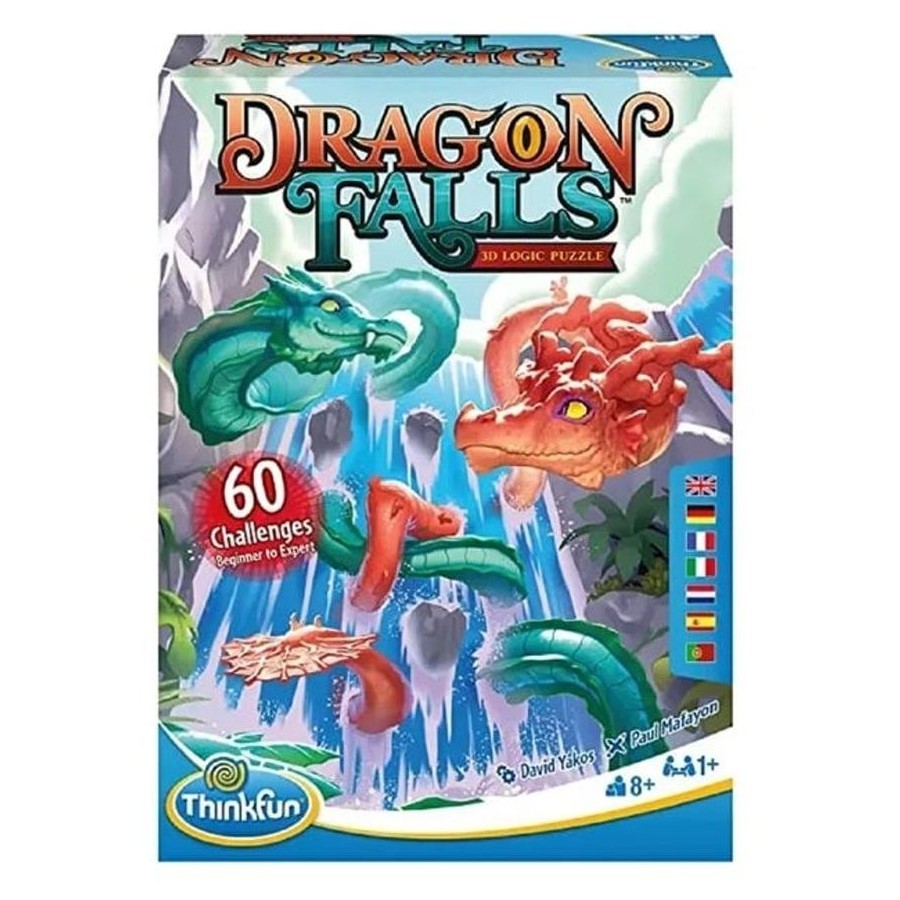 Water Dragons are legendary sea serpents known to soar together back-and-forth through powerful, crashing waterfalls. In Water Dragons, players bring this mythical scene to life! Start by choosing 1 of the 60 beginner-to-expert level Challenge Cards and place Dragon Segments and Blockers on the vertical, double-sided Game Grid as shown. Your goal is to place the remaining Dragon Segments to complete the bodies for both the sleek Teal Dragon and the rugged Coral Dragon. Their serpentine bodies will intertwine through the waterfall and around the jutting rocks in clever ways, putting your spatial reasoning skills to a legendary test!