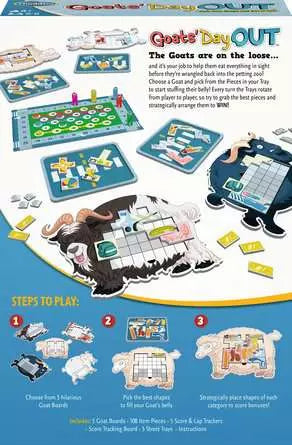 The Goats have gone wild and are eating everything in town! Choose a goat and pick from the pieces in your tray to start stuffing their bellies. The food supply rotates as the goats chomp, munch, and consume their way around time. This isn't just a feeding frenzy, you have a gut to fit the food into! Great for groups of friends, this wacky, fast-paced game will have you laughing as hard as you are thinking! Perfect for a game night with goofy goats keeping the party lively! Stay ahead of the game by strategizing which pieces fit best inside your goat's stomach. But don't get too far ahead of yourself, as the trays rotate every turn and the goats every round! Much, crunch, arrange, pass, repeat! Enjoy hours of entertainment with ThinkFun's Goats' Day Out! Please note: No real-world goats were harmed in the making of this game! Just goat-fueled fun, frivolity, and chaos included!