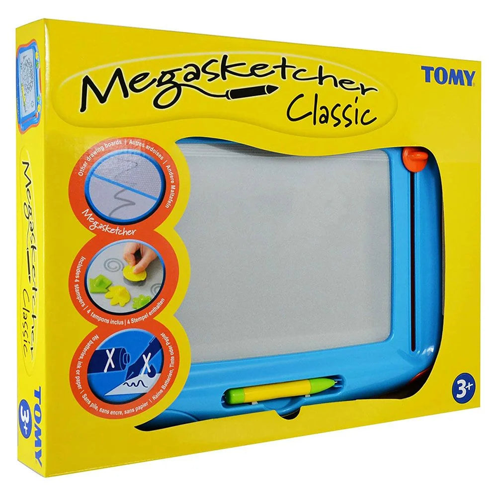 The magnetic Megasketcher drawing board has a unique special screen that allows budding artists to draw clear, crisp pictures. The pictures magically disappear with one sweep of the eraser ready to start again. There is a pen to draws with and four shape stampers are also included