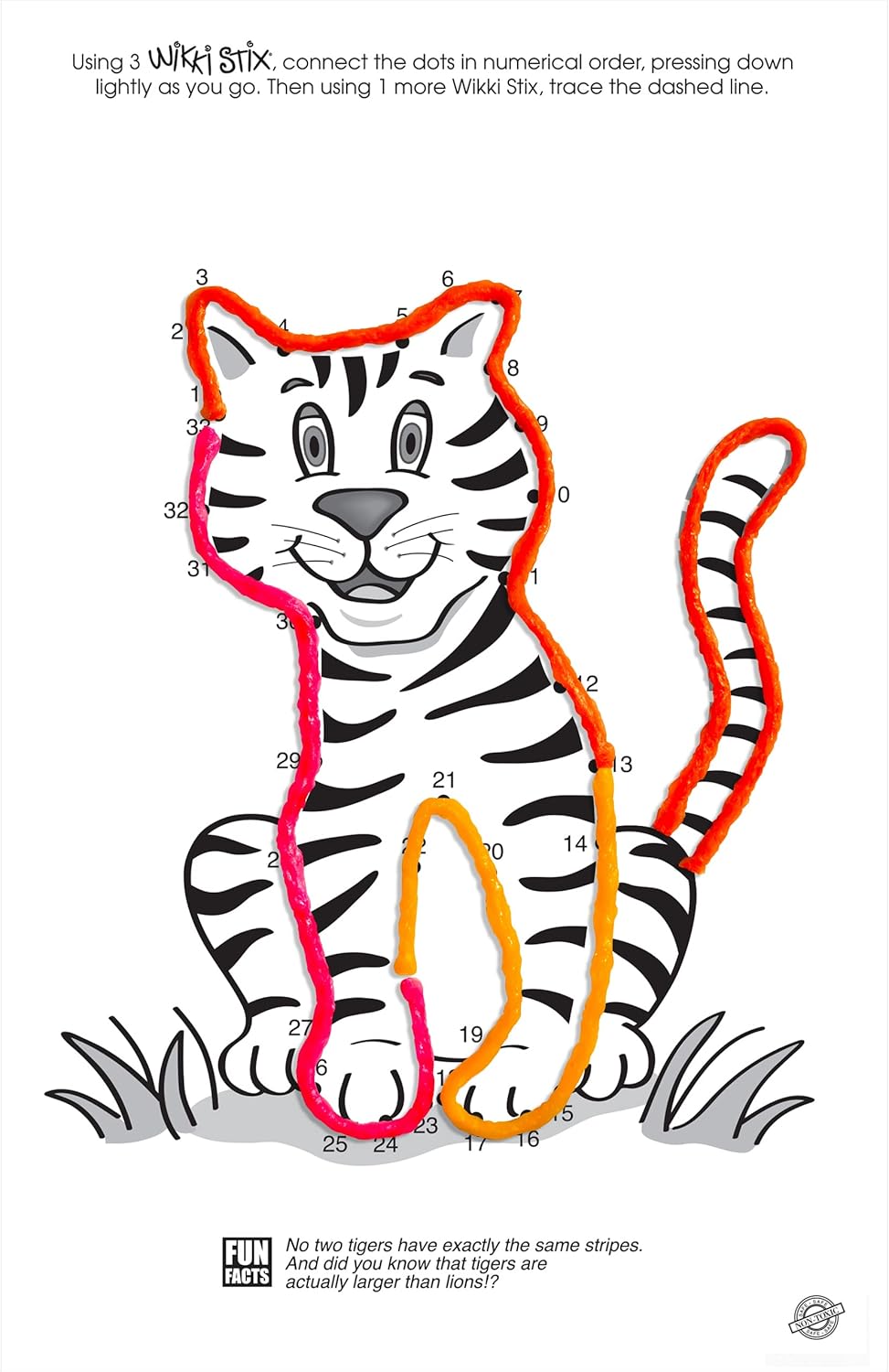 Fun facts and fun activity: 12 individual mini-play paks, each featuring a connect-the-dot zoo animal to be completed with 8 colorful Wikki Stix in each pak.