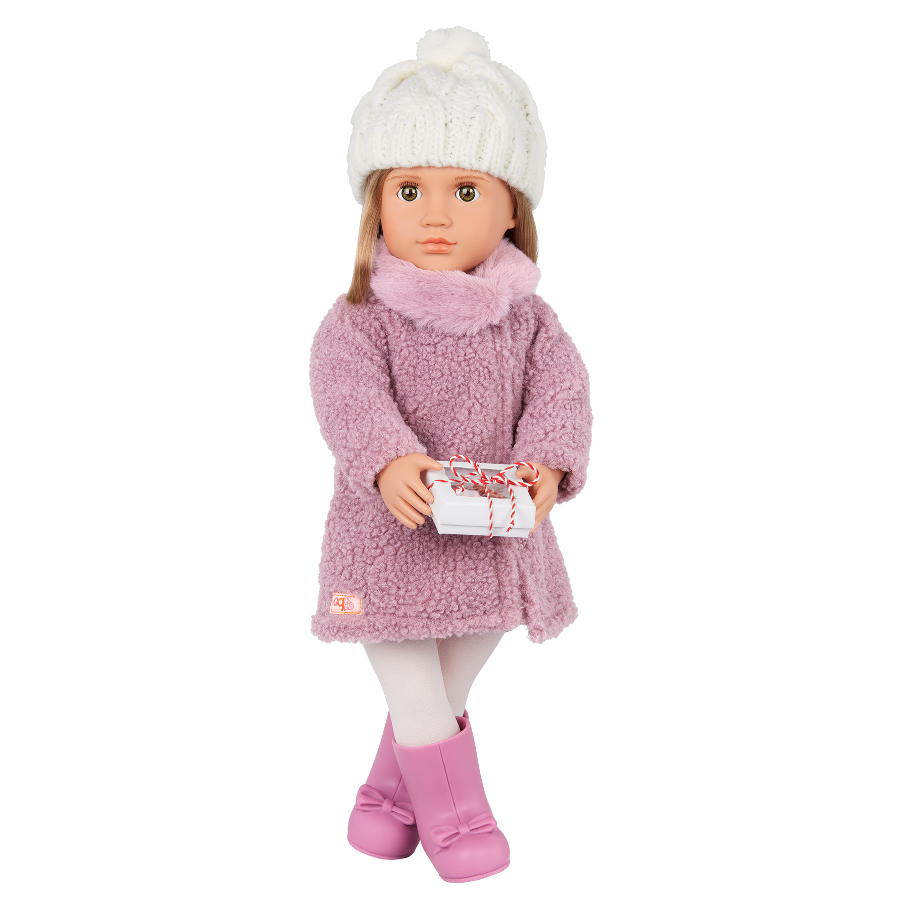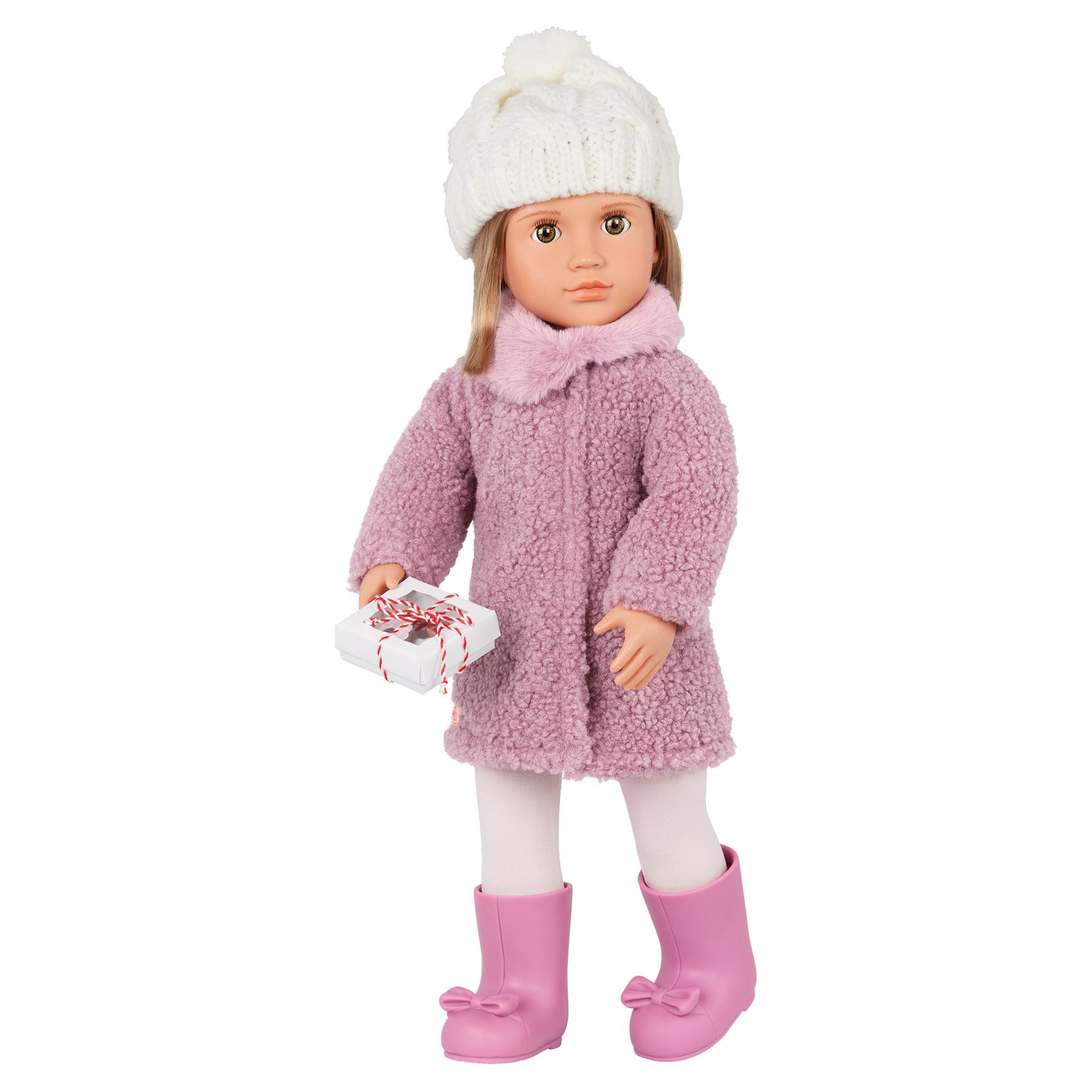 Bundle up your 18-inch doll with the Our Generation Wonderfully Warm outfit and celebrate chilly days together with friends! Dress your bestie in the snuggly sherpa coat with the faux-fur lined collar as they get ready to head outdoors. Complete the look with the cute pom pom hat and stylish booties. Then grab the treat box to deliver a sweet surprise - it's filled with 4 delicious cookies and neatly wrapped with a pretty bow! This outfit also has easy-open closures to quickly put on and remove, so your Our Generation dolls can mix, match, and look fashionable on every fun adventure! (Dolls sold separately)