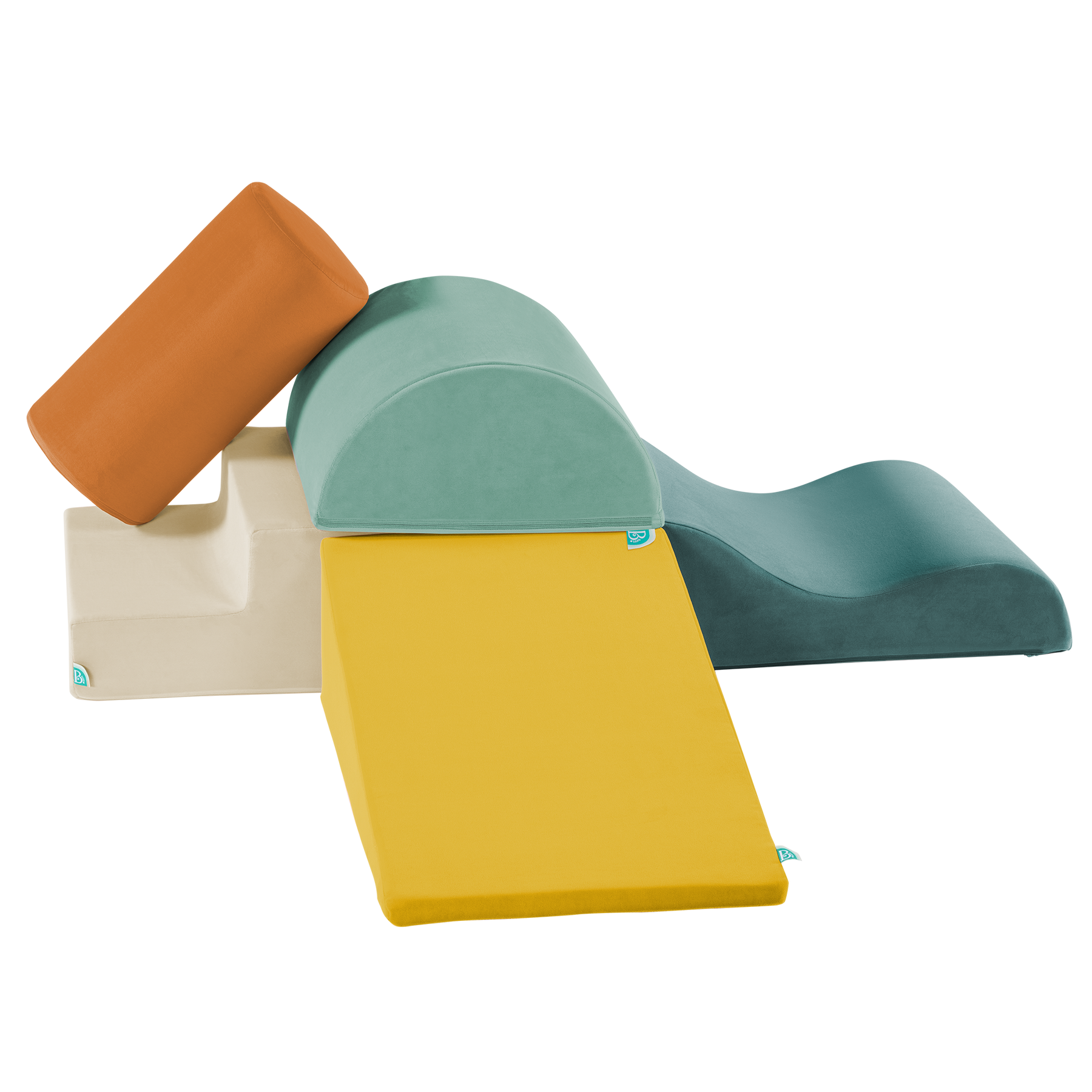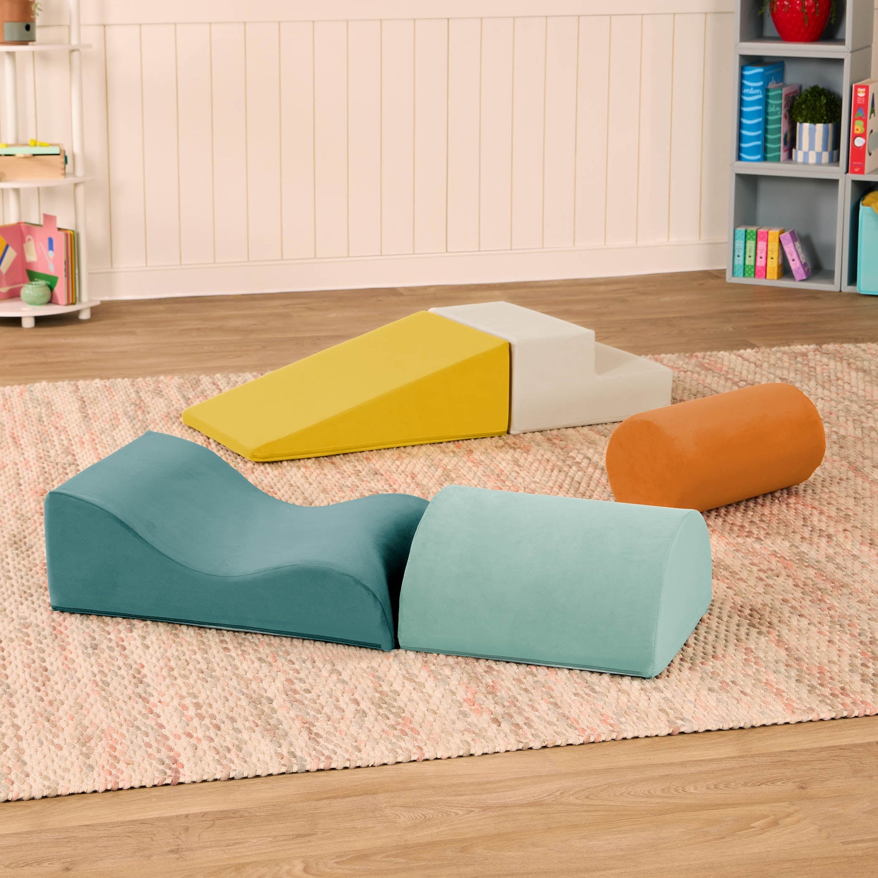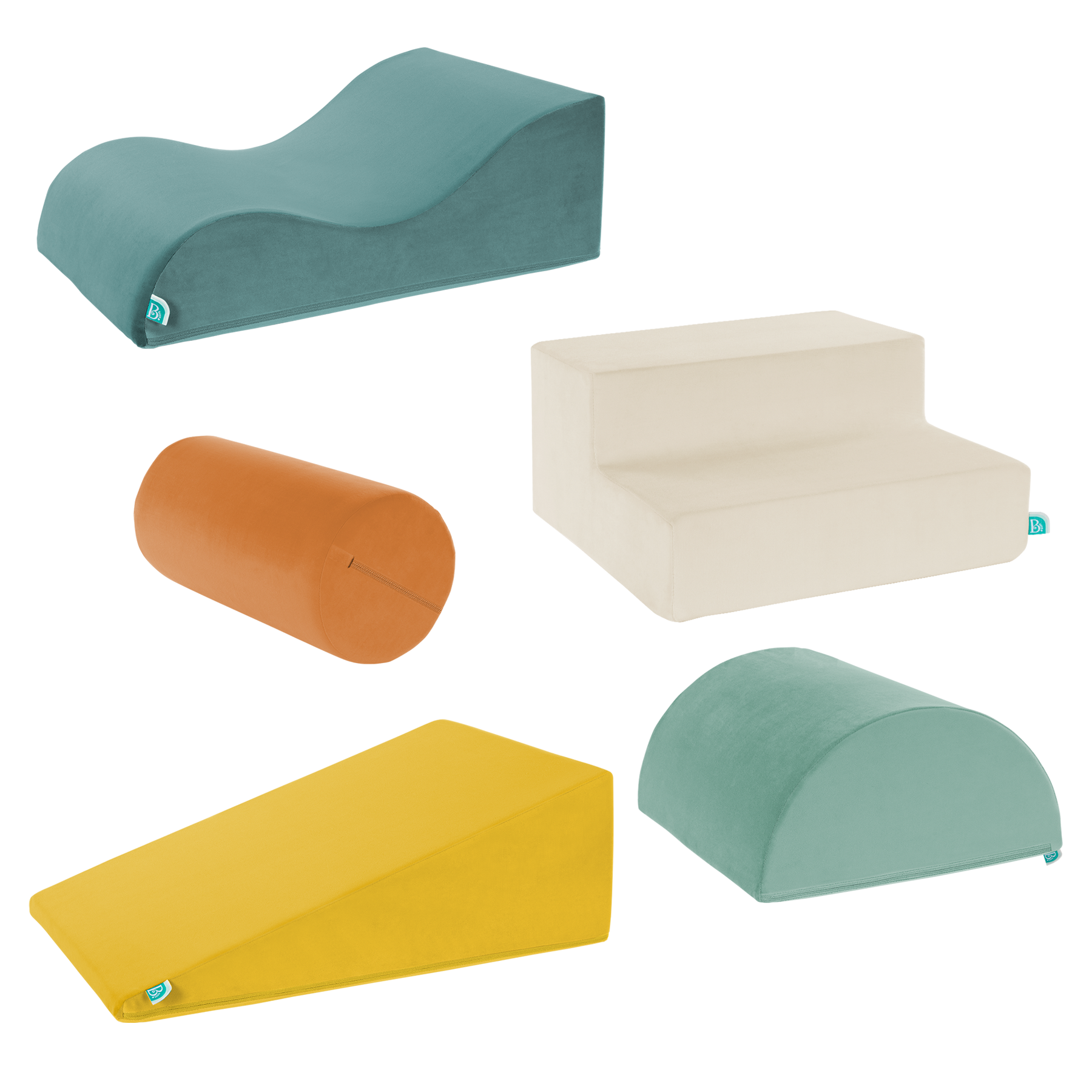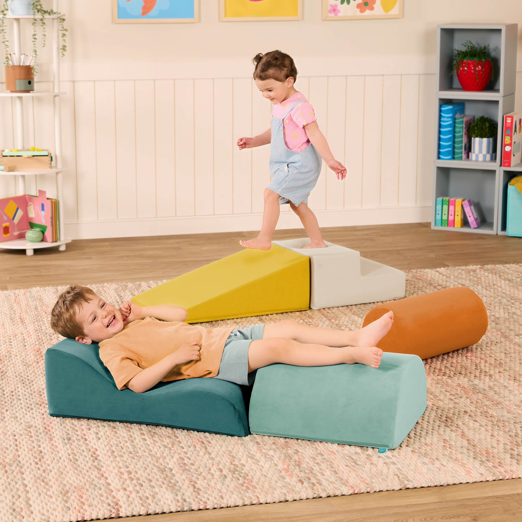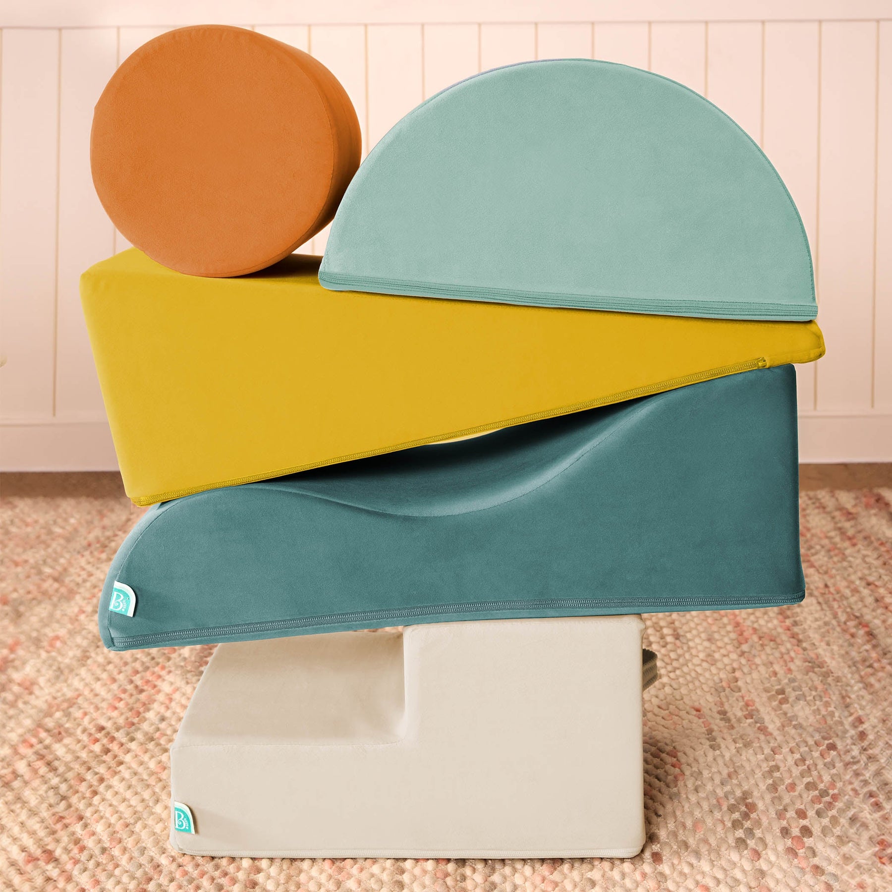 Build, play, and smile with a squishy set of WonderShapes from B. toys! This 5-piece set of foam shapes includes one plush stair, ramp, cylinder, wavy ramp, and half-cylinder to build and play with! Open 'em up and watch them expand to their full size — like magic! Stack and place them to create an obstacle course, or add them to fun forts for endless possibilities! As kids crawl and clamber over the super-soft shapes, they'll be developing gross motor skills, and this set is a great way to stay active indoors. The machine-washable covers are easy to remove and toss in the wash to keep fresh, and the handles allow kids to rearrange their play space any way they please. Recommended for kids 12 months and over.