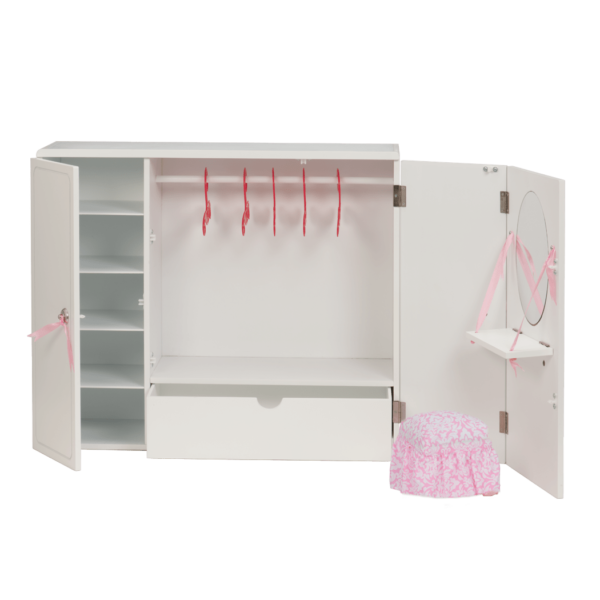 Keep your doll clothes neat and tidy with the Our Generation Wooden Wardrobe, a super-cool closet for 18-inch dolls! This furniture set has tons of storage space for all of your doll clothes and accessories! The Wooden Wardrobe arrives fully assembled so you can play right away. Five interior shelves are perfect for storing shoes, purses, folded clothes, hats, or anything you imagine! Five doll clothes hangers let you hang up dresses and shirts in the closet. The pull-out drawer is big enough to hold larger doll accessories like boots and backpacks (or maybe your doll's secret diary – Just make sure to hide it well!) Position the double door to act as a dressing room screen, and use the movable stool to help your dolls primp in front of the mirror and fold-down shelf. Made of sturdy, lightweight wood, you'll want to pass this wardrobe on from this generation to the next! (Dolls and outfits sold separately)